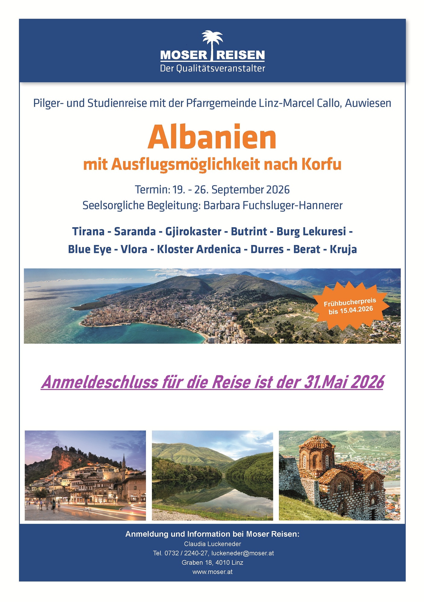 Albanien Reise 2026 Die Pfarrgemeinde zum Sel. Marcel Callo organisiert vom 19. - 26.9.2026 eine Reise nach Albanien. Den detaillierten Reiseablauf finden Sie hier. Wer sich anmelden möchte, kann das hier machen. Anmeldefomulare und der Reiseablauf liegten ausgedruck auch im Pfarrzentrum auf! mehr: Albanien Reise 2026