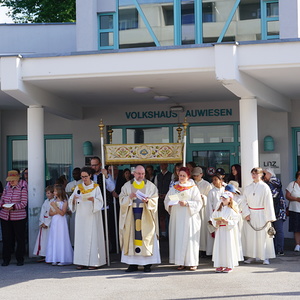 Zum ersten Mal haben wir das Fest Fronleichnam gemeinsam mit der Pfarre Kleinmünchen St. Quirinus gefeiert. Vom Wüstenrotplatz ist ein immer länger werdender Zug, angeführt von der Musikkapelle, den Pfadfindern und dem kroatischen Kulturverein, dem Himmel und der Monstranz folgend zur Kirche St. Quirinus gegangen.