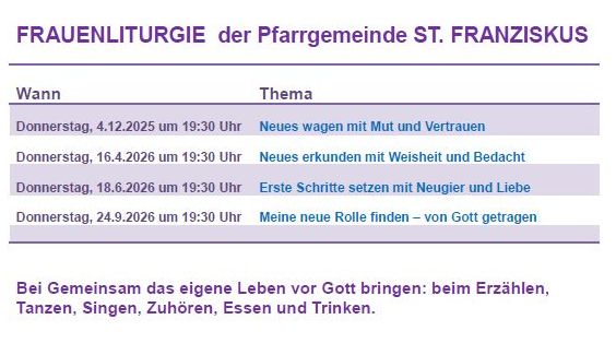 Alle Frauen, die gemeinsam mit anderen Frauen ihr eigenes Leben im Reden, Tanzen, Zuhören, Singen, Beten, Essen und Trinken vor Gott bringen wollen sind herzlich eingeladen.