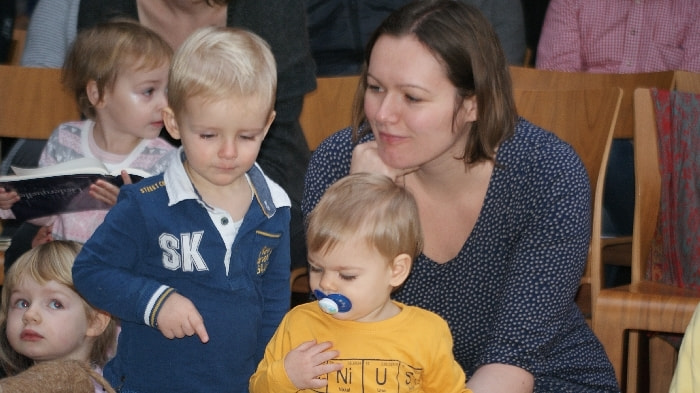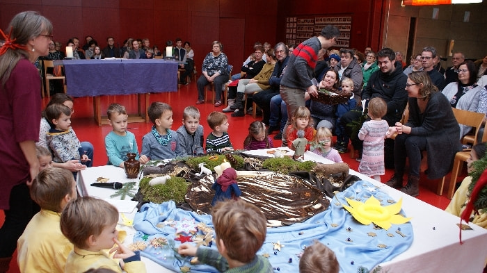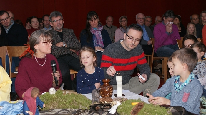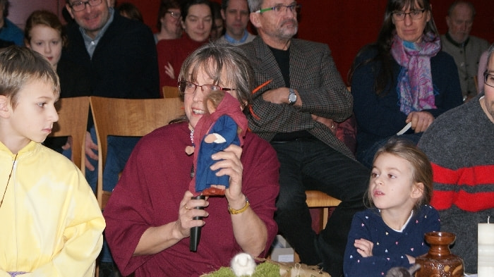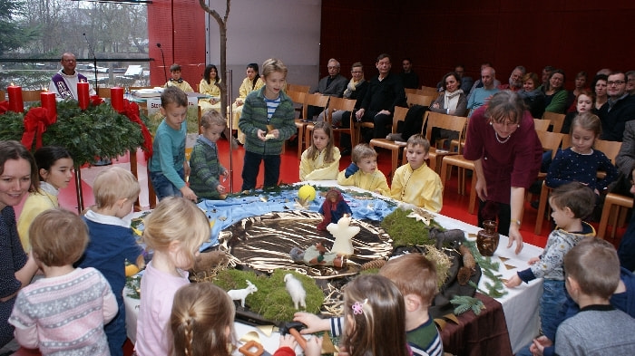 Der dritte Adventsonntag steht unter dem wunderschönen Thema „Guter Hoffnung sein“ mit all den Gefühlen und Gedanken die Maria und Josef als werdende Mutter, als werdender Vater begleiten. Maria, Josef und ein Engel kommen zu dem Bild hinzu.