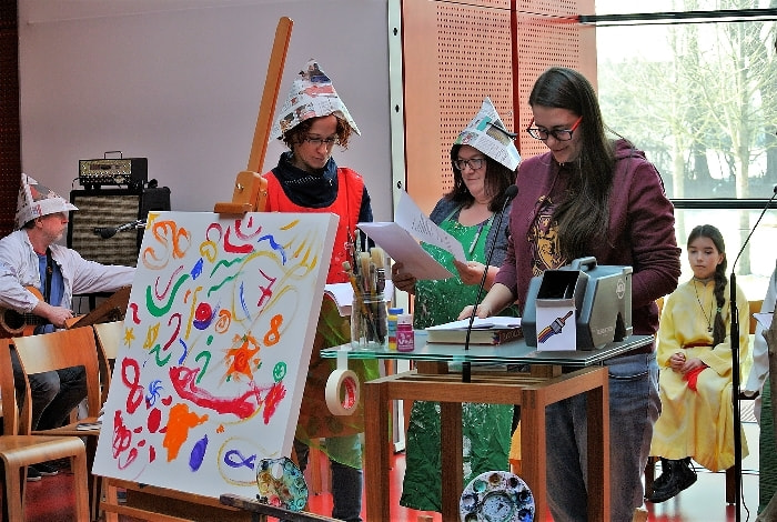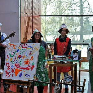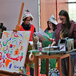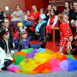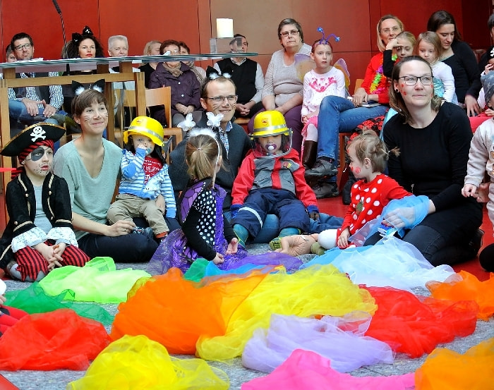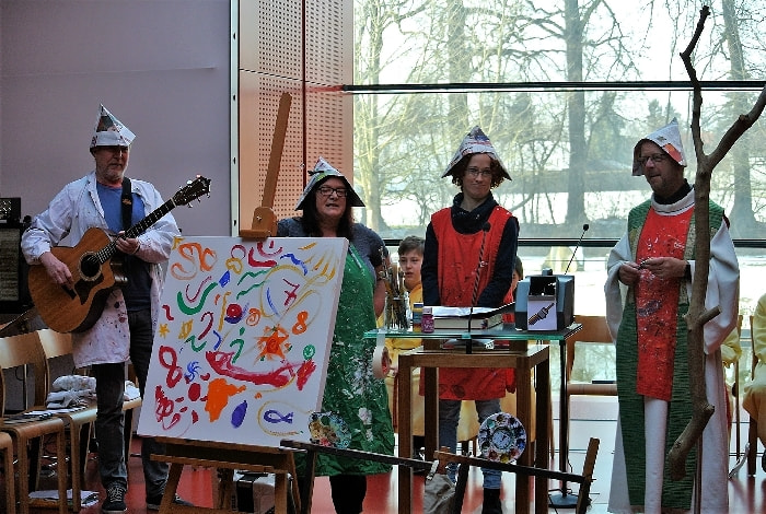 und das konnten wir auf vielfache Weise erfahren: Nach dem gemeinsamen Einzug, bei dem sich viele herrlich bunt verkleidete Kinder an bunten Tüchern festgehalten haben, stellte sich das "Himmlische Streichquartett" Anton Anstreicher, Hansi Abtö(r)ner, Silvia Maler und Sigrid Pinsel die schwierige Frage, welche Farbe denn die Richtige wäre. In der Geschichte vom Streit der Farben behauptete jede Farbe von sich, die ALLERwichtigste auf der Welt zu sein. Nur der Regen konnte diesen Streit schlichten. Er ließ alle Farben zusammenrücken und gemeinsam einen goßen Bogen über den Himmel spannen, den Regenbogen. Denn vor Gott sind alle Farben gleich!