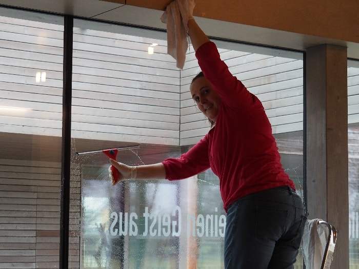 Es wurden hierbei Teile der Kirche gereinigt, welche für die wöchentliche Reinigung zu aufwendig und unzugänglich sind. Das Deckenglas im Kirchenraum (in ca. 7m Höhe) sowie die Frontglaswand wurden auf Hochglanz gebracht.