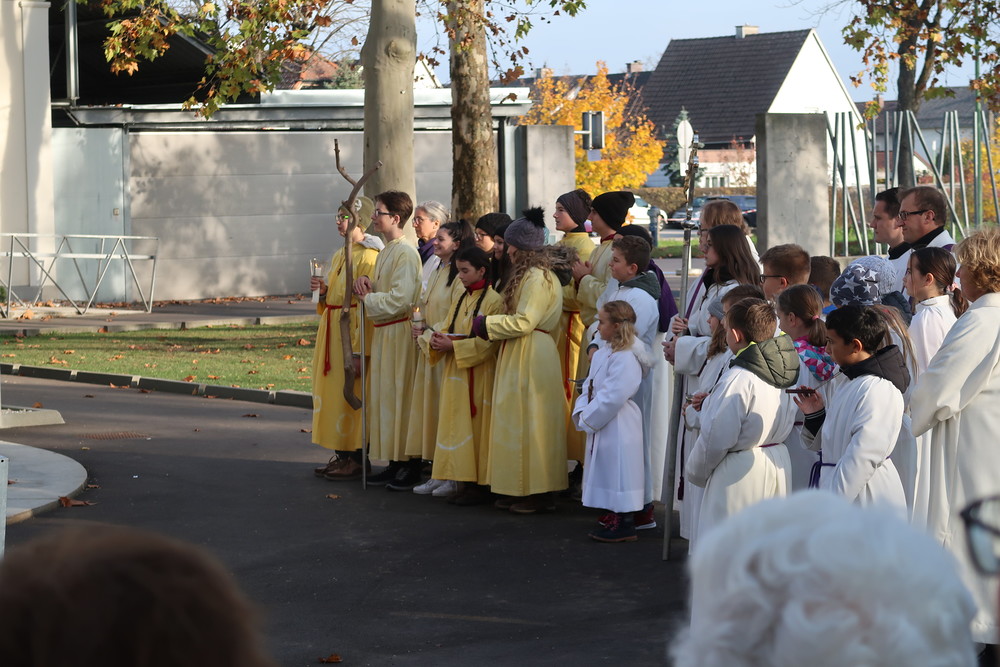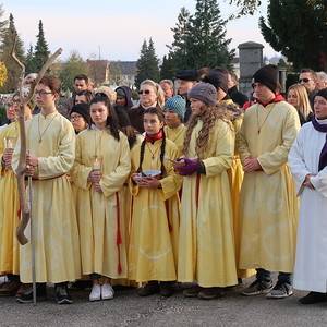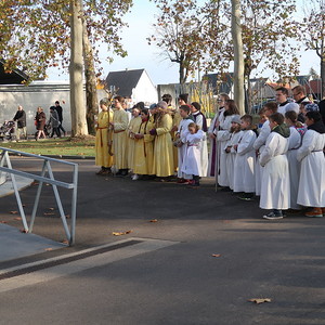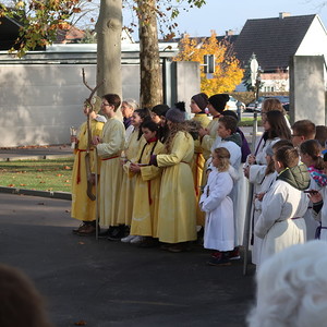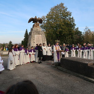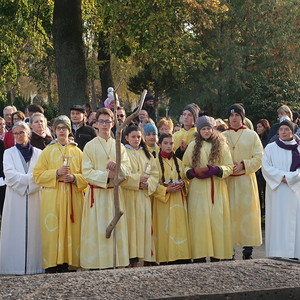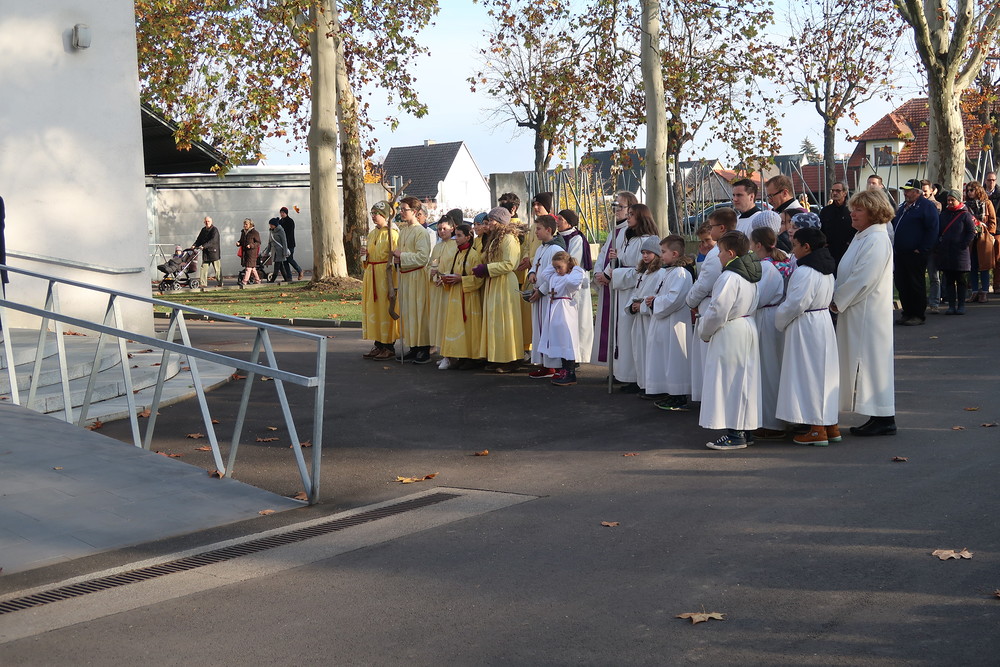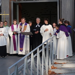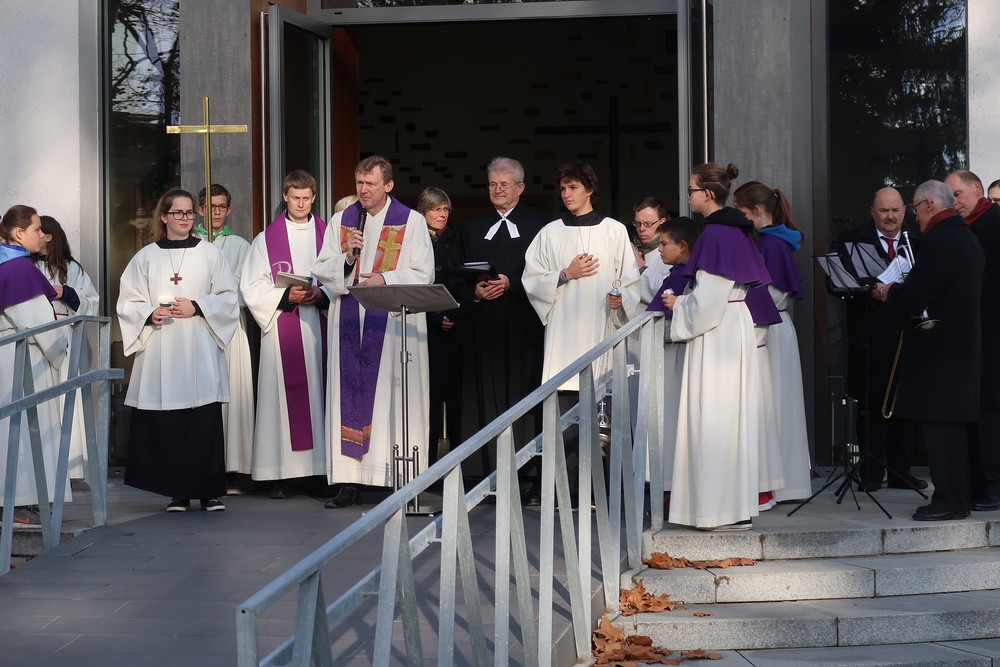 Nach dem gemeinsamen Beginn vor der Aussegnungshalle, umrahmt von einer Bläsergruppe, führte die Prozession weiter zum Kriegerdenkmal.
