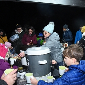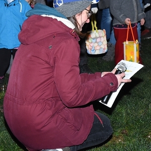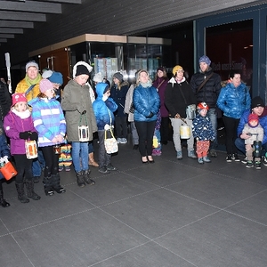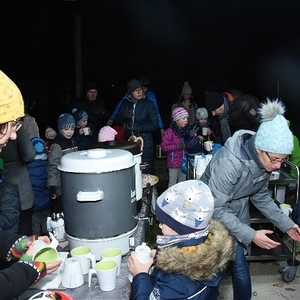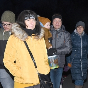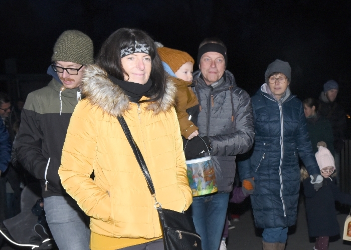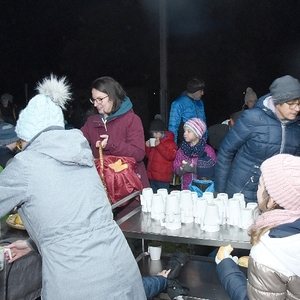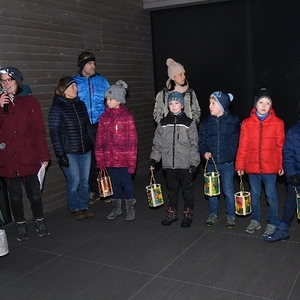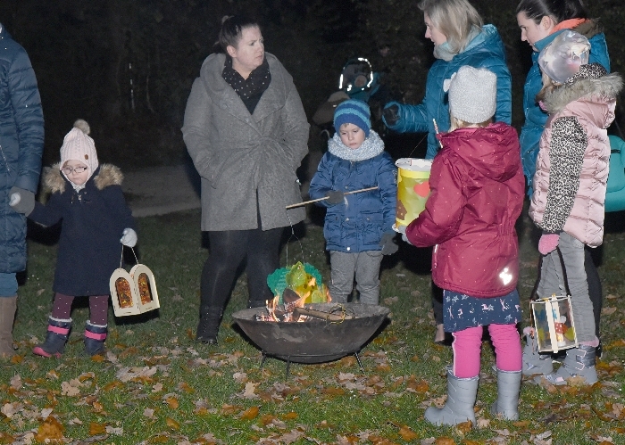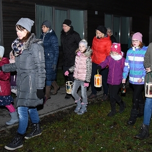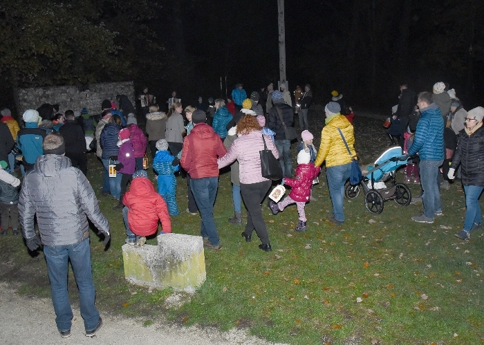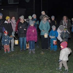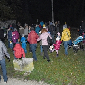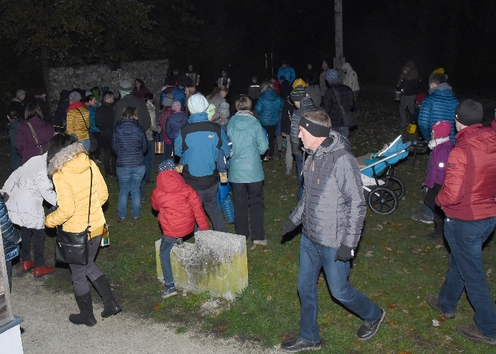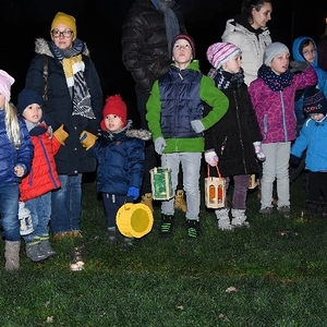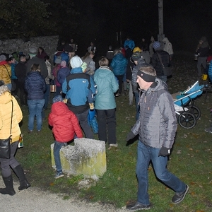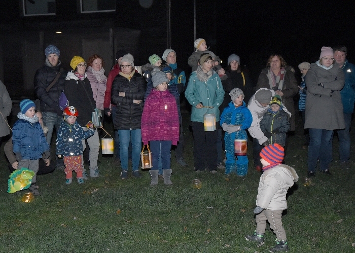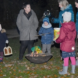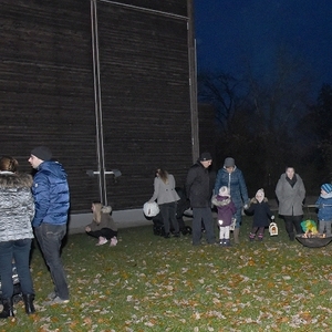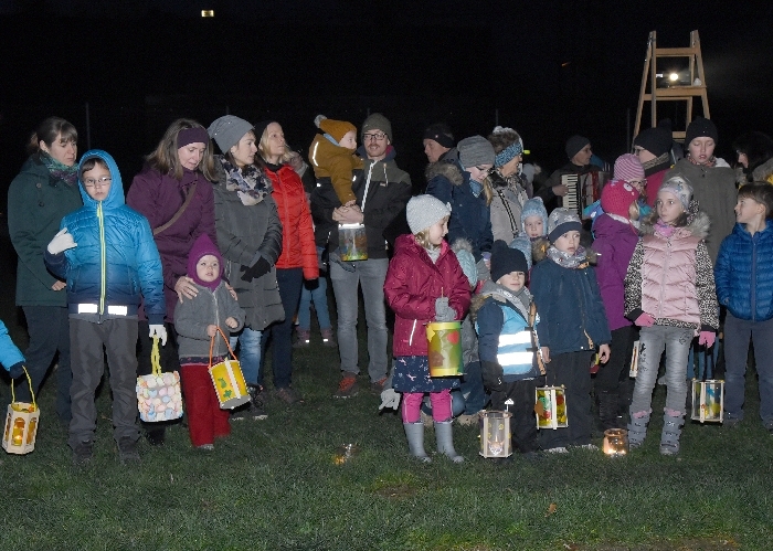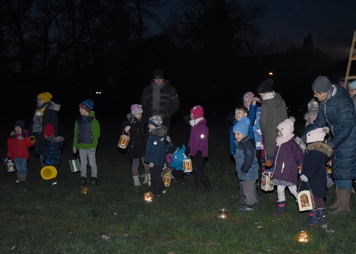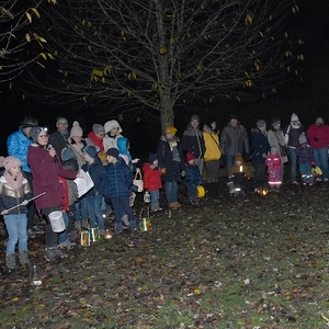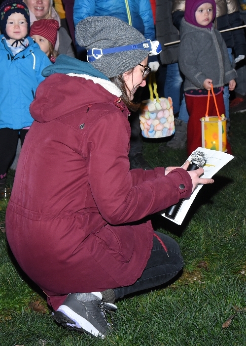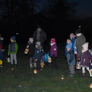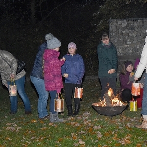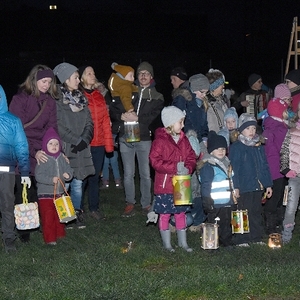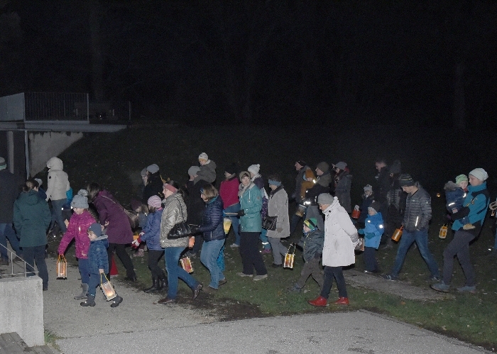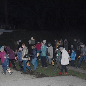 Auf der großen Pfarrwiese erreichten wir die erste Station, wo Renate die Geschichte des Heiligen Martin erzählte. Mit einem Diaprojektor erstrahlten am Wiesenhügel verschiedene Bilder der Martinsgeschichte. Da leuchteten nicht nur die schönen mitgebrachten Laternen, sondern auch die Kinderaugen.