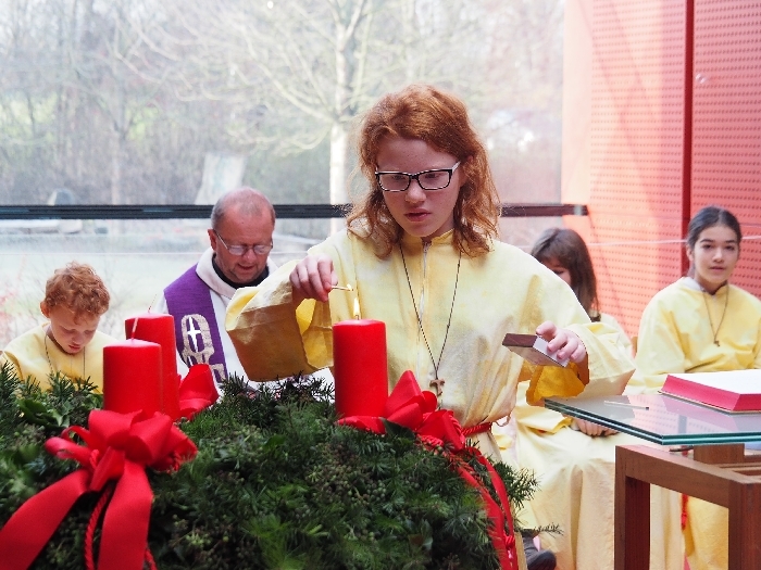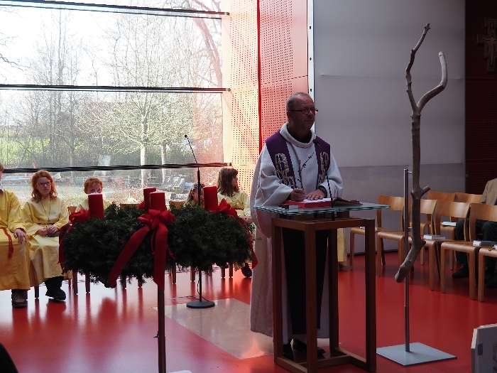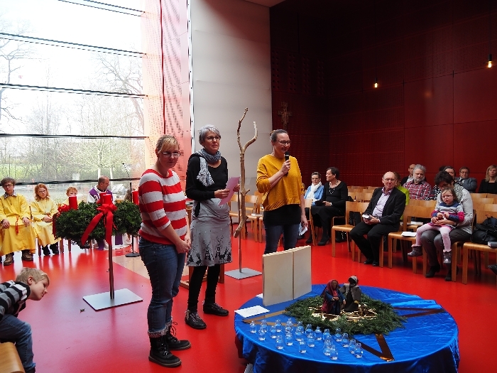 Auch die Kinder durften kleine Zweige in die – am Kinderelemente Tisch – vorhandenen Vasen stellen und einen Zweig samt einem Ausmalbild der Hl. Barbara mit nach Hause nehmen.