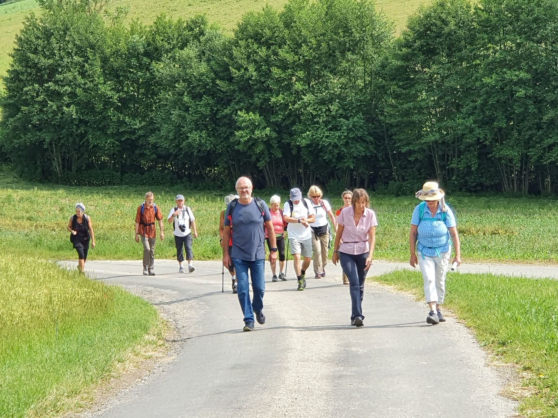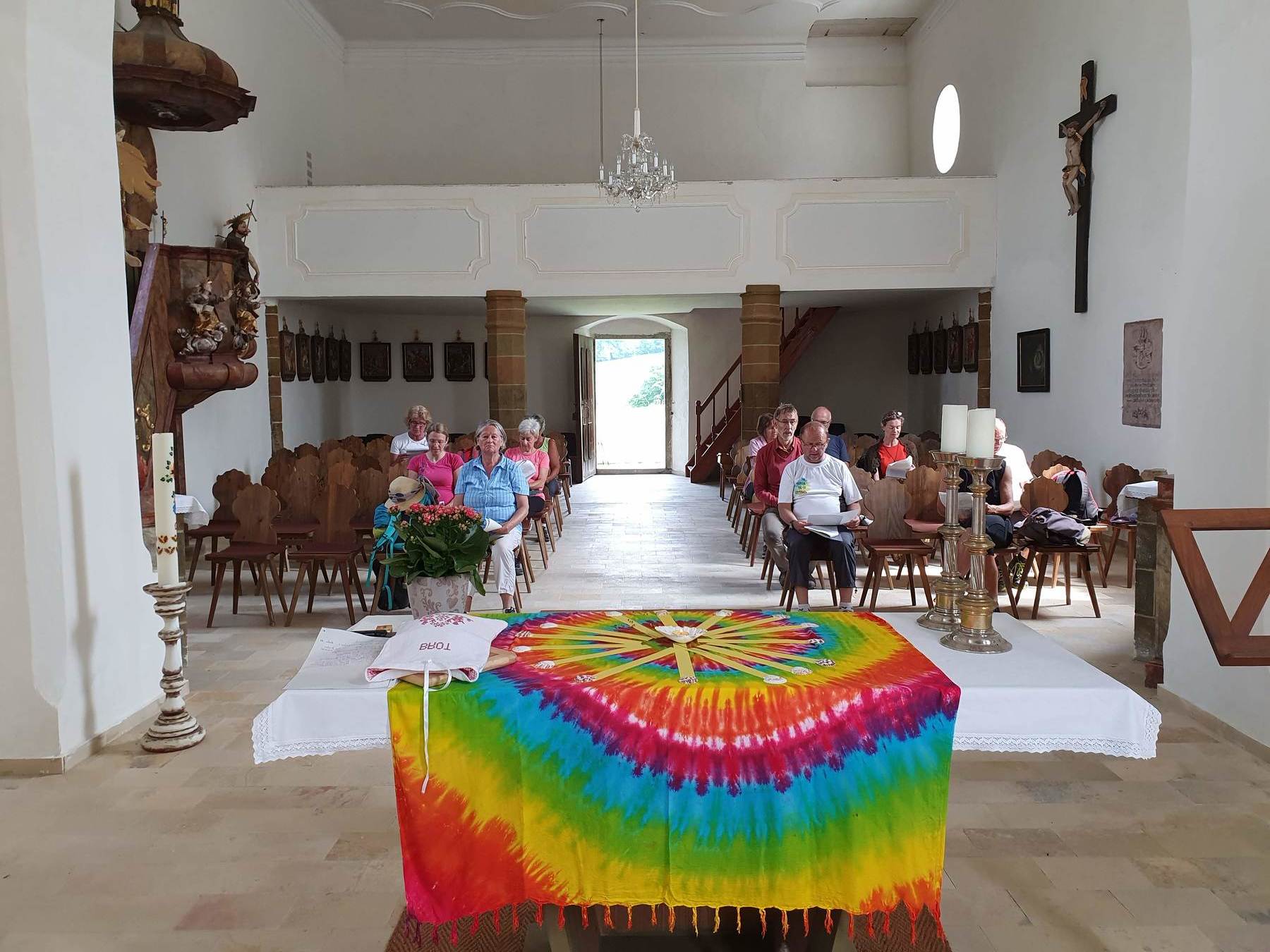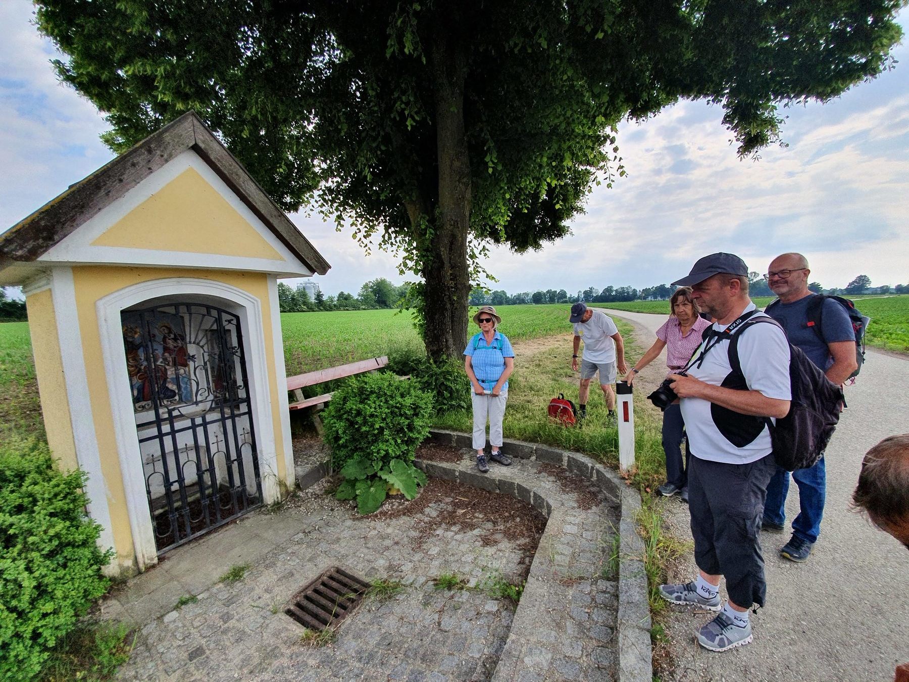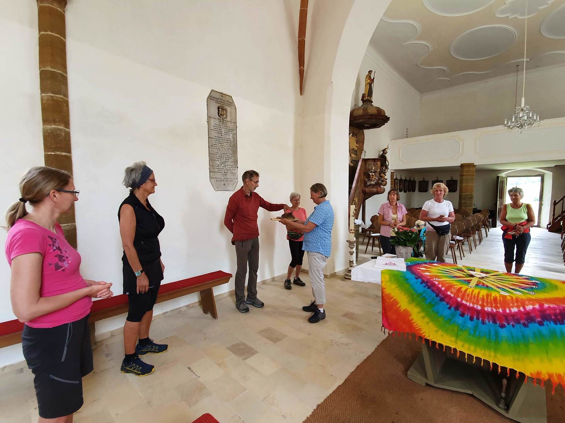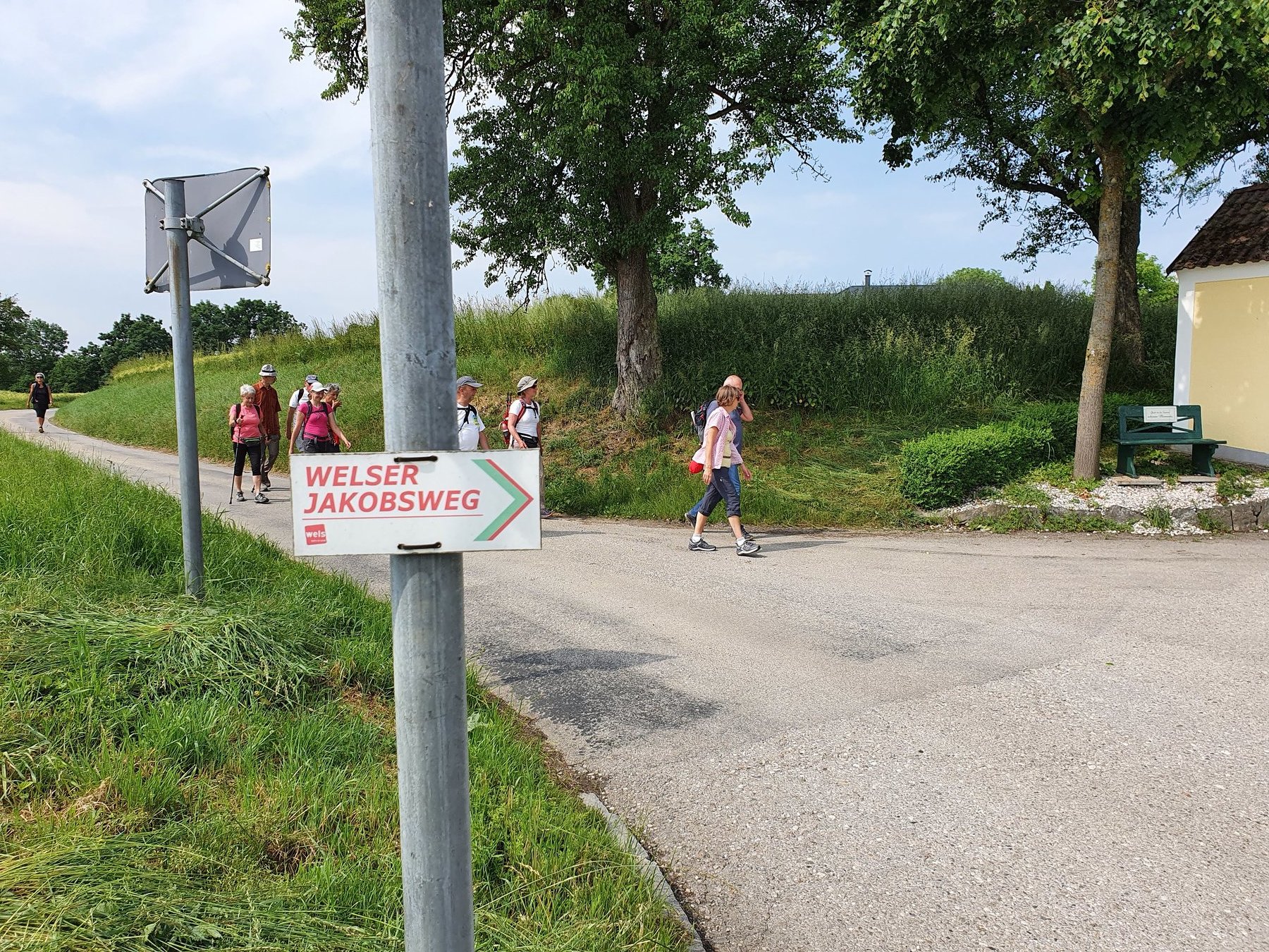 .....Vorbei an Marterl, wanderten wir in dieser wunderschönen Landschaft nordwestlich von Wels. Bei den Kapellen entlang des Weges hielten wir inne und hörten passende Bibeltexte. Weiter gings zur „Jakobskirche" in Unterirrach. Diese Filialkirche wurde erstmals 1134 urkundlich erwähnt und wurde von der Familie Schwantaler 1734 barockisiert. Die Jakobsstatue im Hauptaltar zeigt Jakobus mit weitem Mantel, Reisestab, Reisetasche, Wasserflasche und Muschelhut. Nach einer gemeinsamen Andacht in der Kirche und einer Agape im „Grünen“ gings wieder über Fernreith und Oberthan zurück nach St. Franziskus.