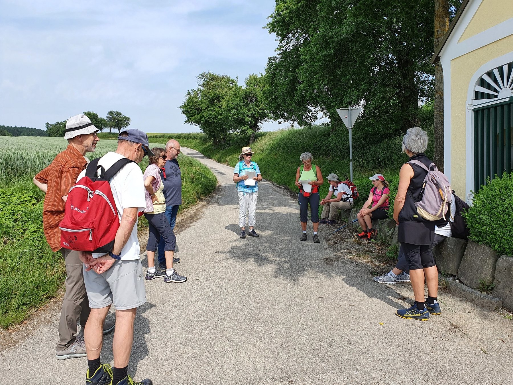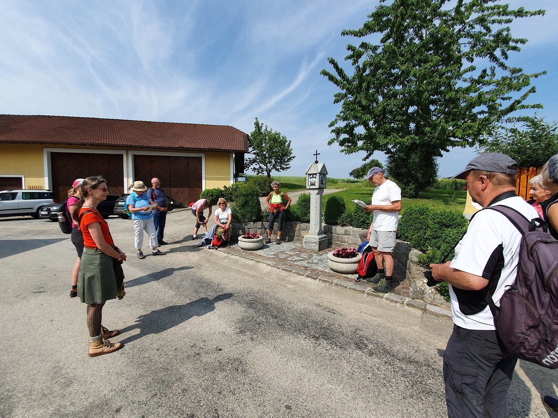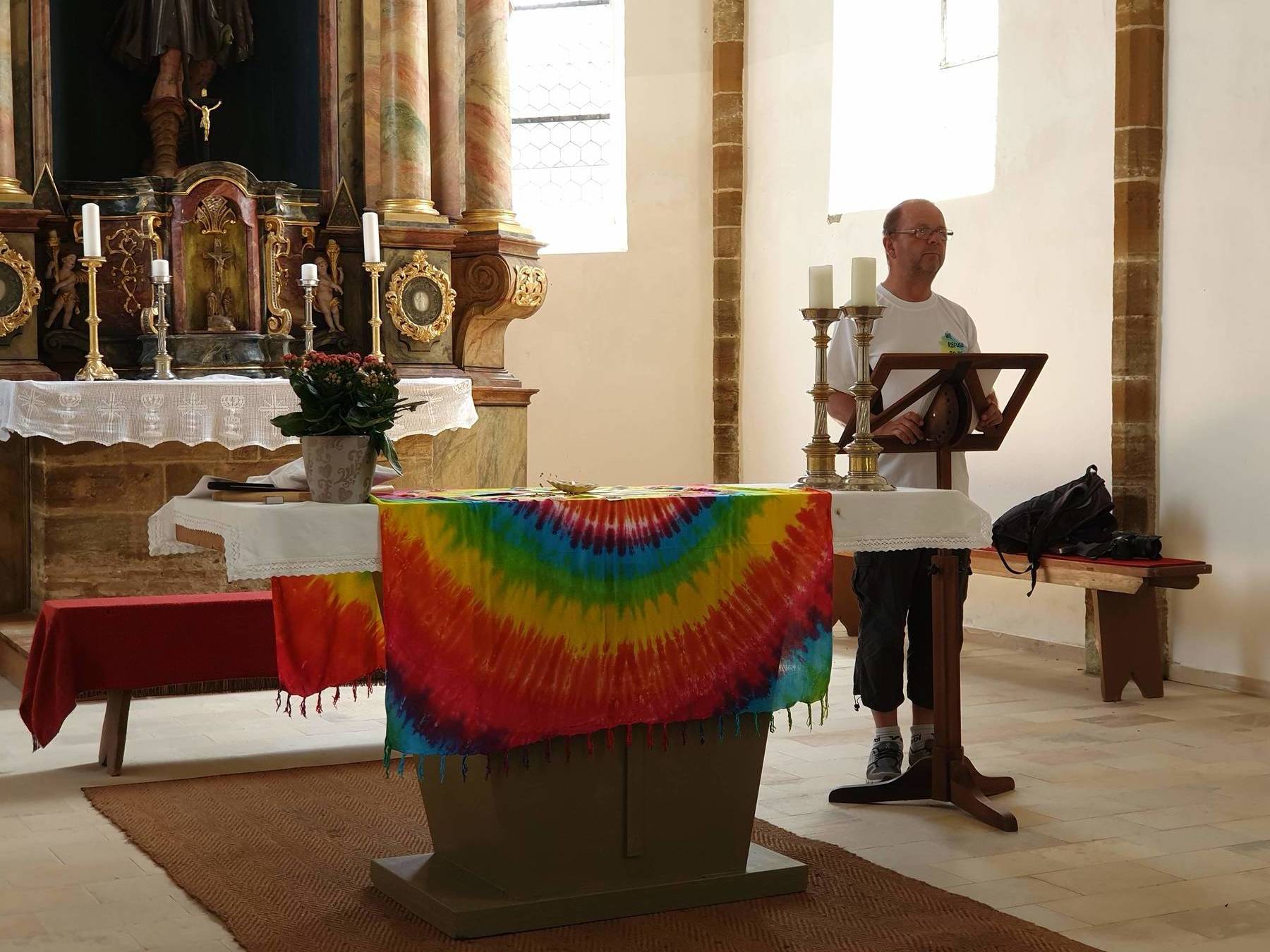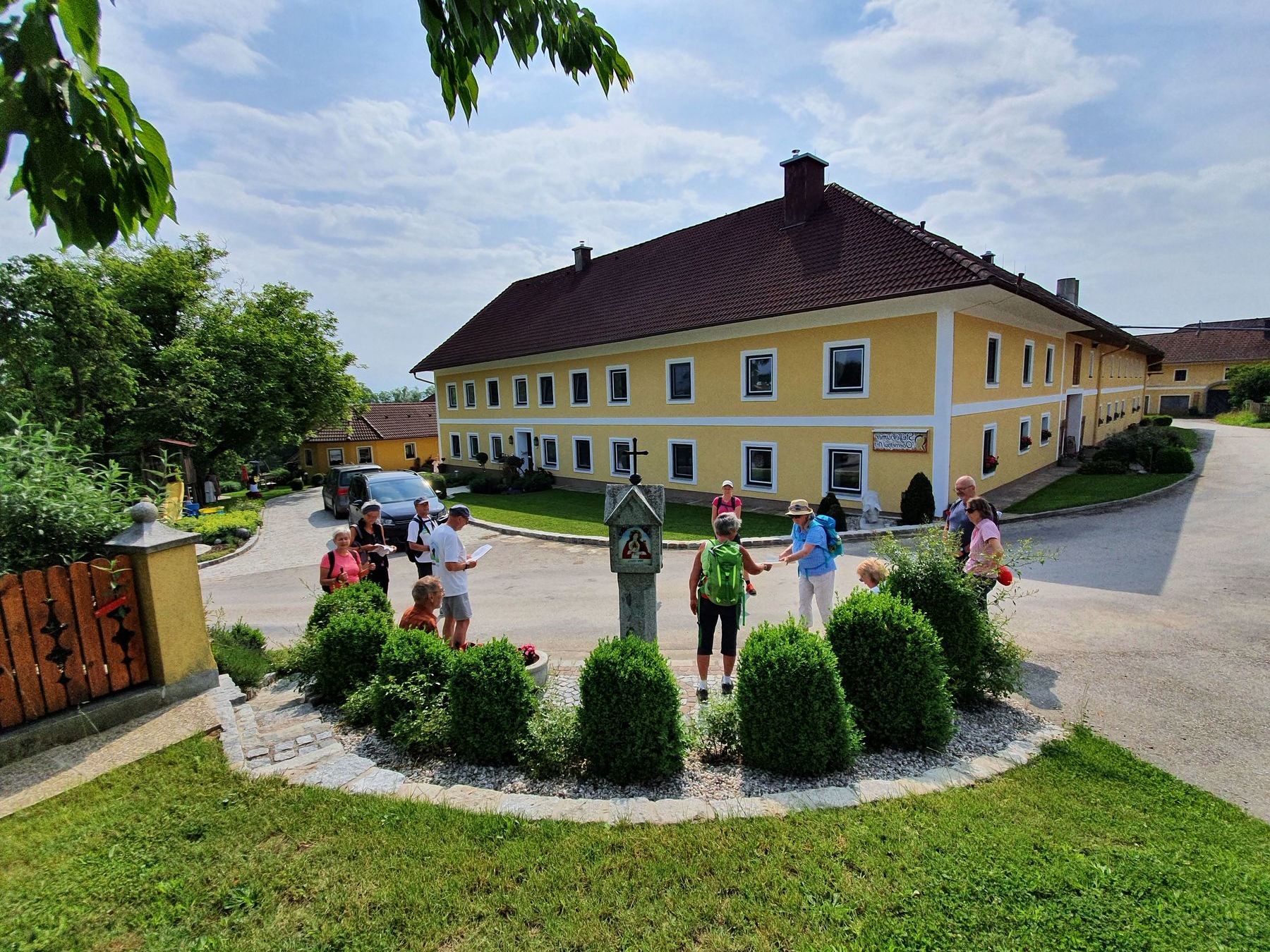 .....Vorbei an Marterl, wanderten wir in dieser wunderschönen Landschaft nordwestlich von Wels. Bei den Kapellen entlang des Weges hielten wir inne und hörten passende Bibeltexte. Weiter gings zur „Jakobskirche" in Unterirrach. Diese Filialkirche wurde erstmals 1134 urkundlich erwähnt und wurde von der Familie Schwantaler 1734 barockisiert. Die Jakobsstatue im Hauptaltar zeigt Jakobus mit weitem Mantel, Reisestab, Reisetasche, Wasserflasche und Muschelhut. Nach einer gemeinsamen Andacht in der Kirche und einer Agape im „Grünen“ gings wieder über Fernreith und Oberthan zurück nach St. Franziskus.