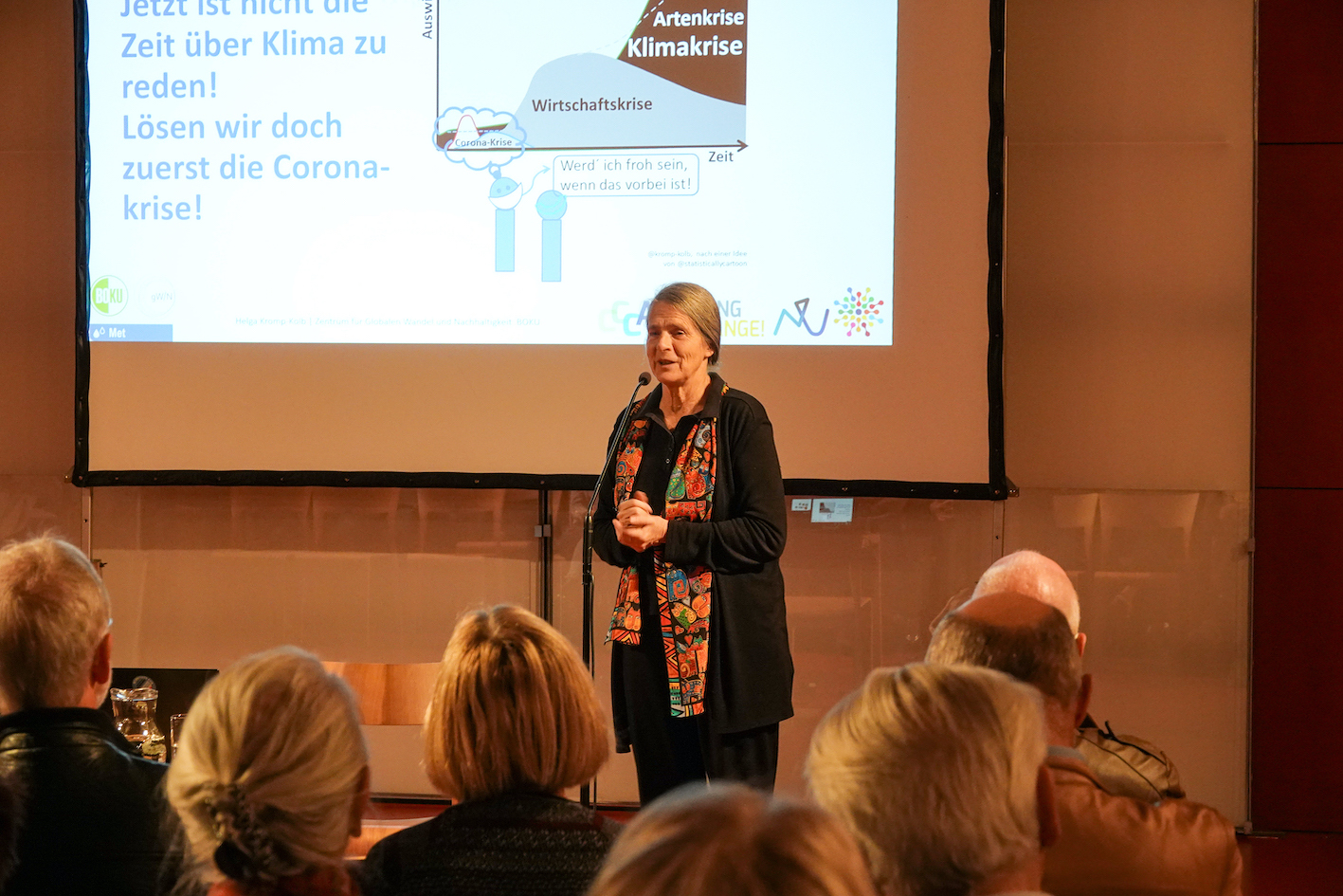 Mit großen Erwartungen kamen die 105 Besucher*innen zum Vortrag von Prof. Dr. Helga Kromp-Kolb und sie wurden nicht enttäuscht. Frau Kromp-Kolb ist es in der kurzen Zeit gelungen, uns die riesigen Gefahren der Klimaerwärmung vor Augen zu führen und uns bewusst zu machen, wie dringend notwendig es ist, jetzt zu handeln, um katastrophale Auswirkungen der Klimaerwärmung zu verhindern bzw. abzuschwächen. Wir alle sind aufgerufen: jede und jeder in seinem Wirkungsbereich, jede Gemeinschaft (auch unsere Pfarre!) und die Politik. Beendet hat sie ihren Vortrag mit der großen Hoffnung, dass ein Umdenken möglich ist, das auch viele Chancen eröffnet.
