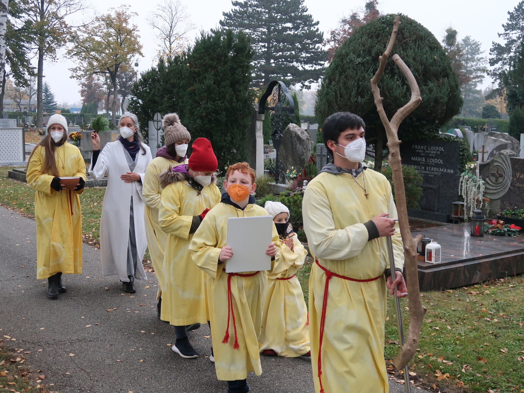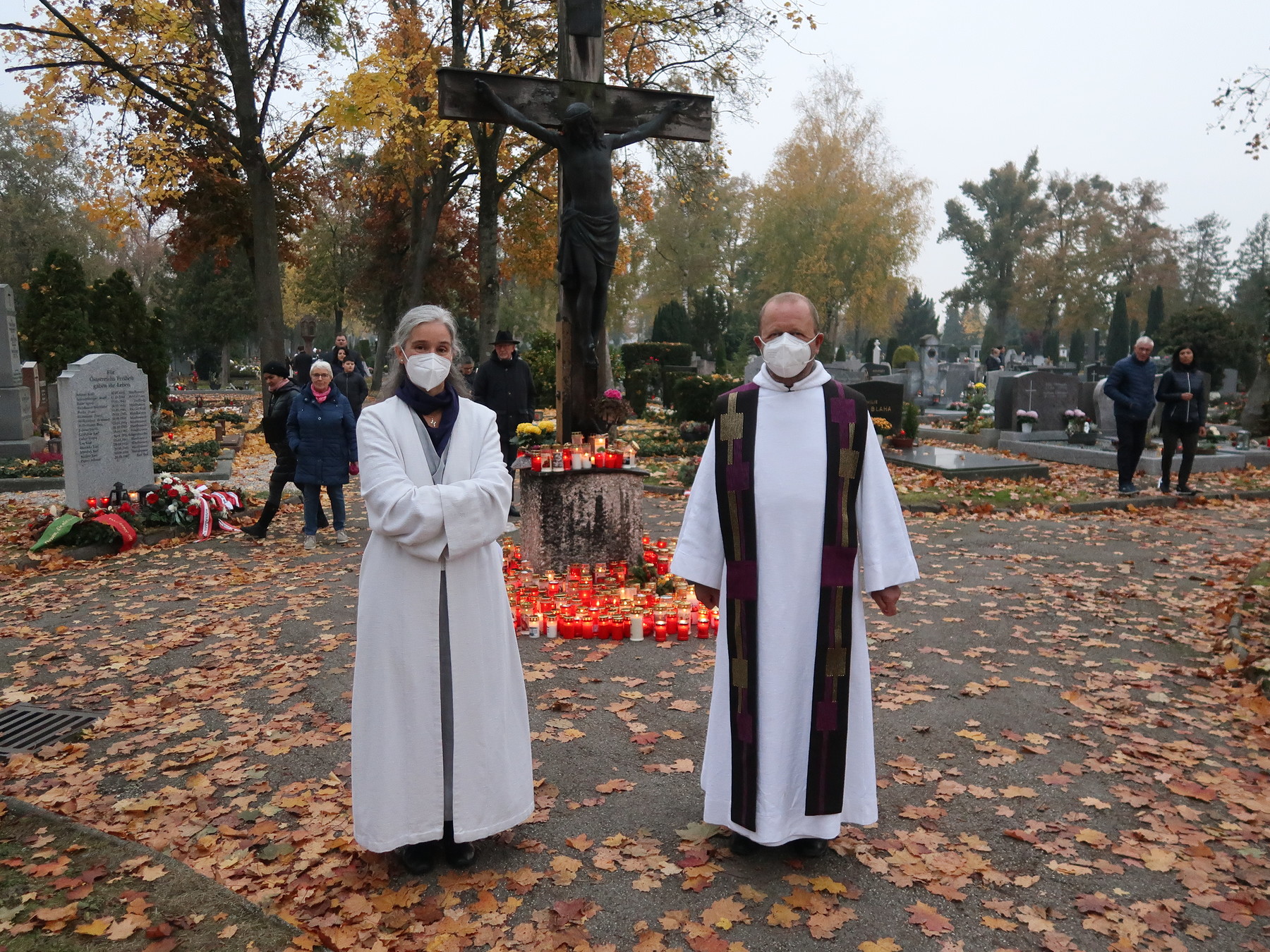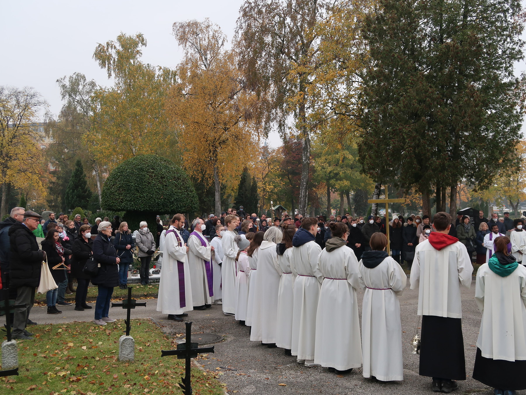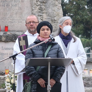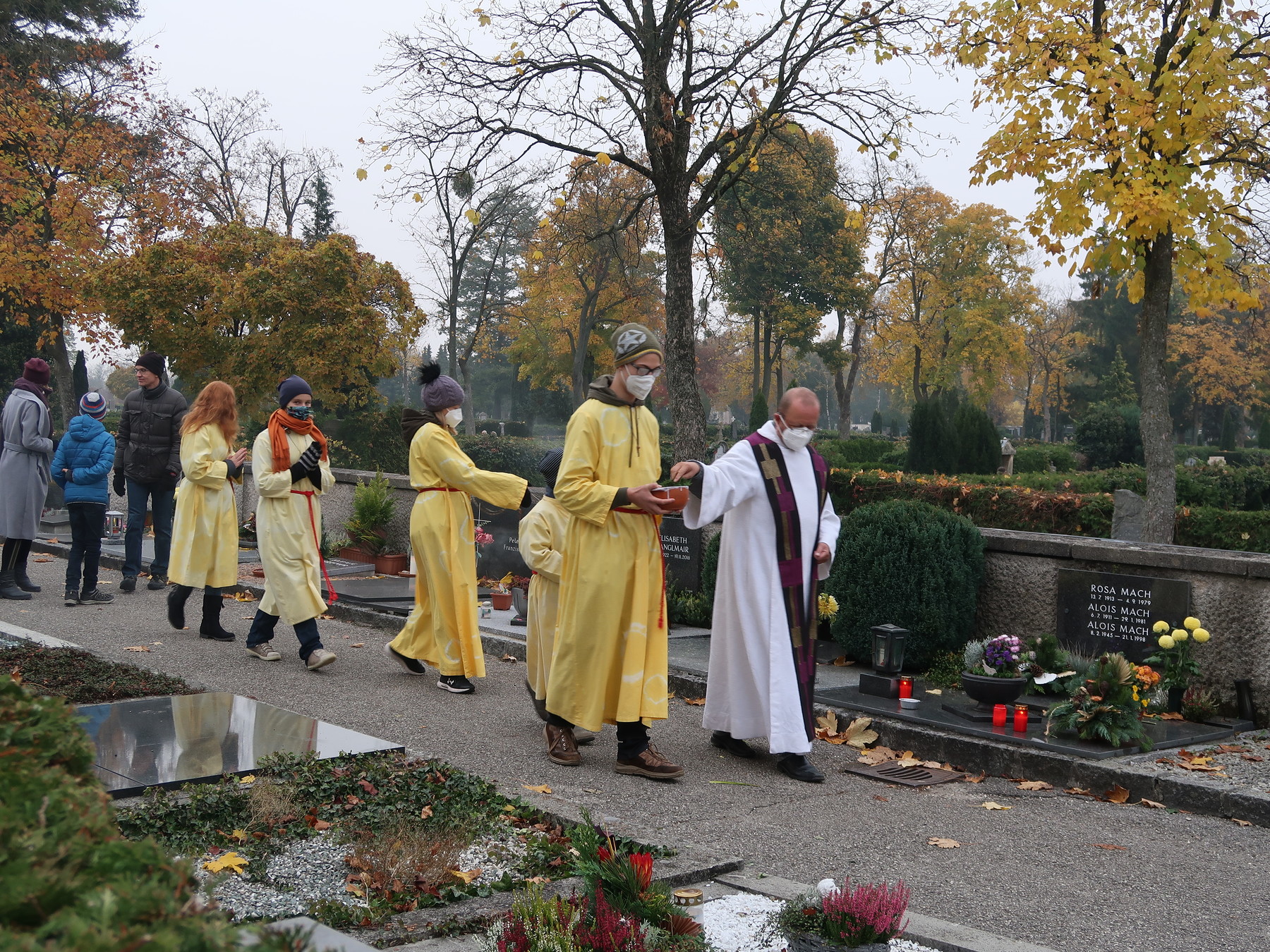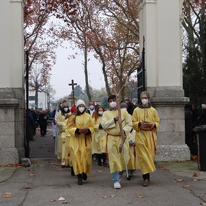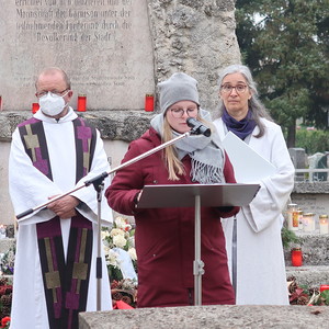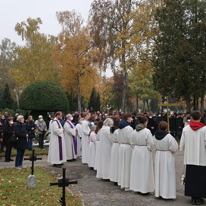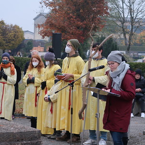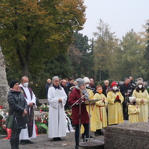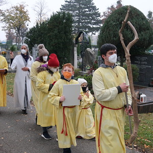 ökumenischen Allerheiligenfeier bei der Aussegnunghalle teil, die von unserer Pfarre gemeinsam mit der evangelischen Pfarre gestaltet wurde. Weiter ging es in einer Prozession zur Gedenkfeier beim Kriegerdenkmal. Nach der Ansprache und gemeinsamen Gebet teilen sich die katholischen Seelsorger*innen der Pfarren auf, und segneten die Gräber.