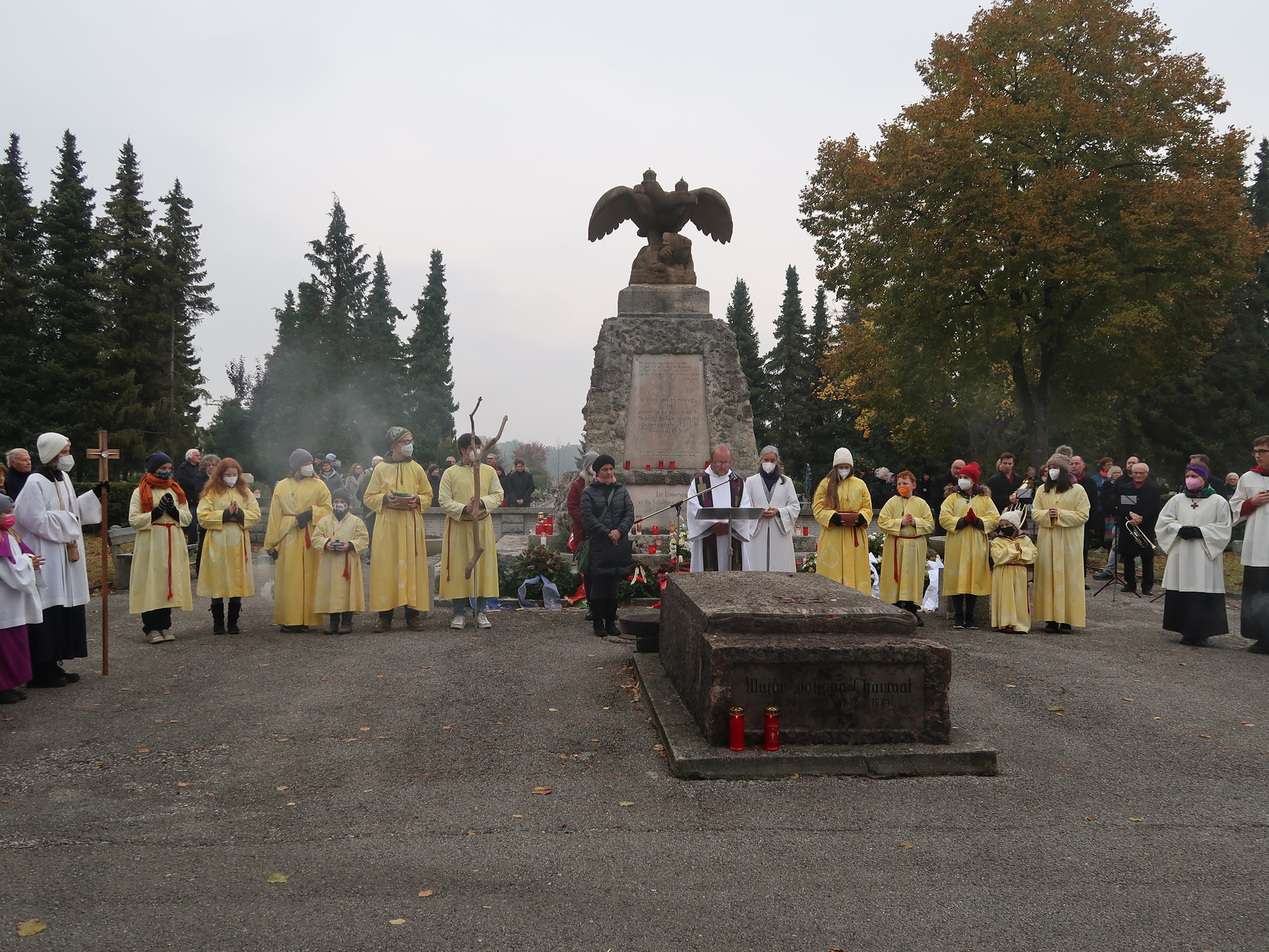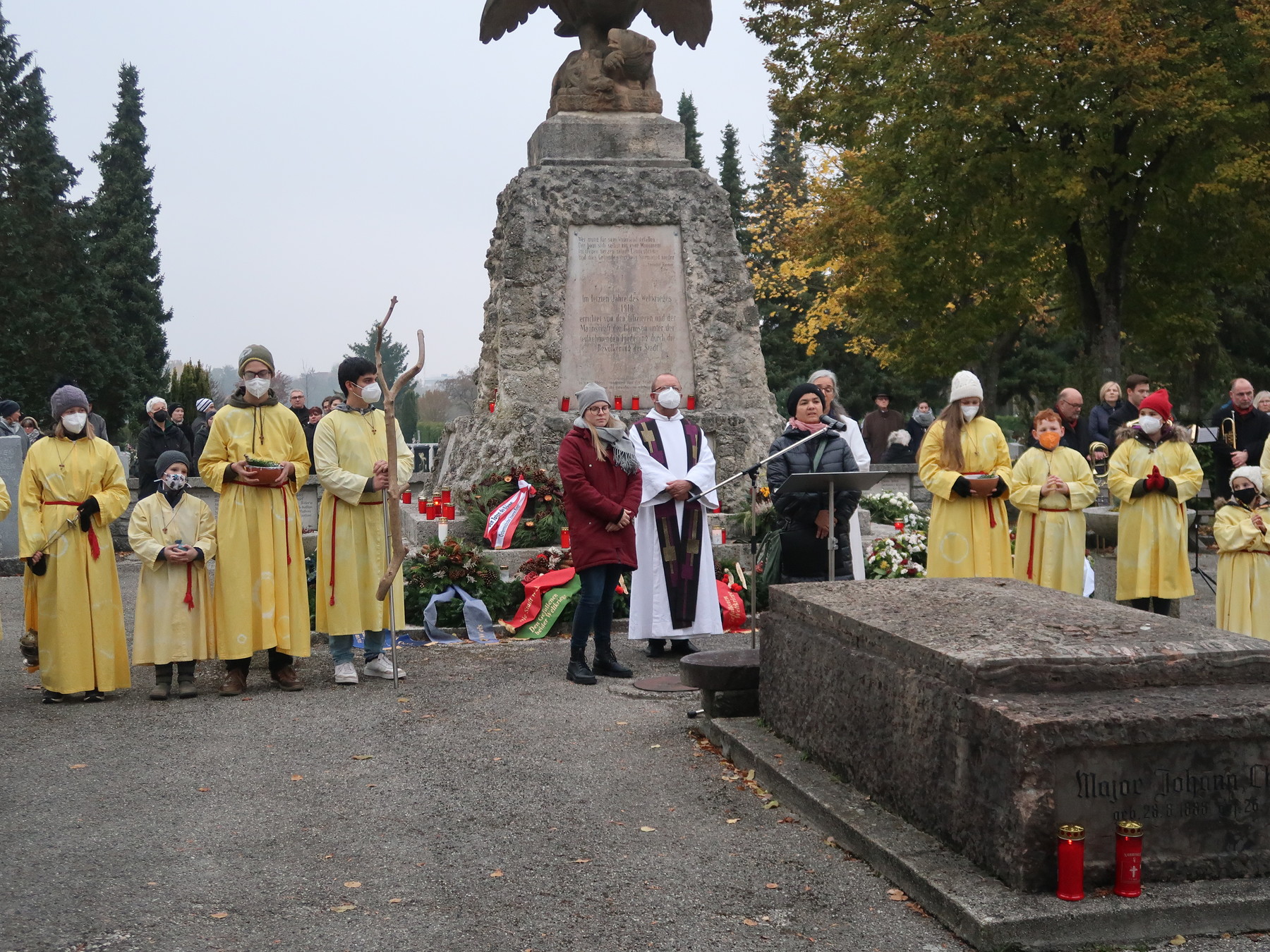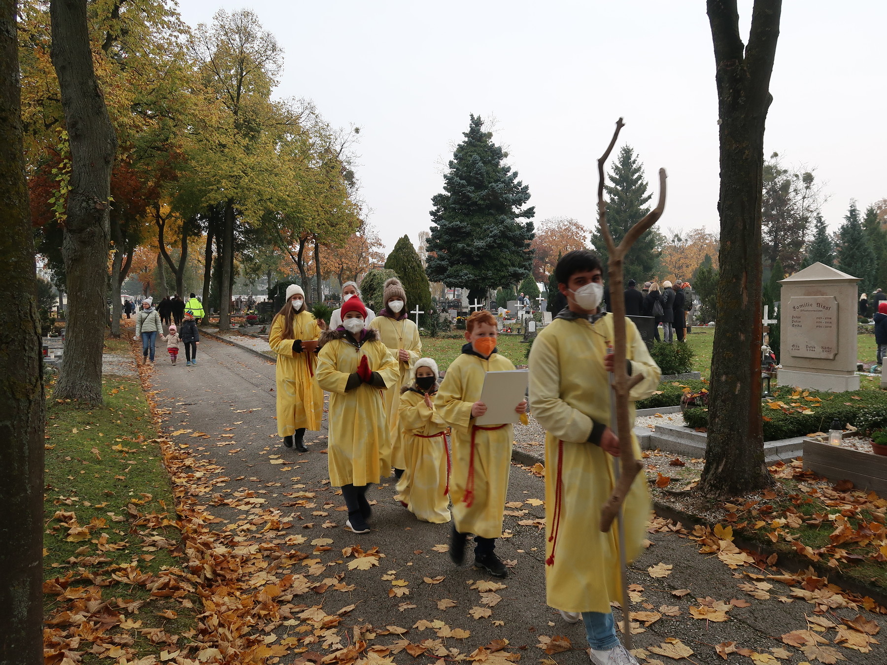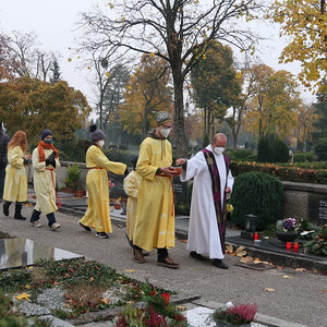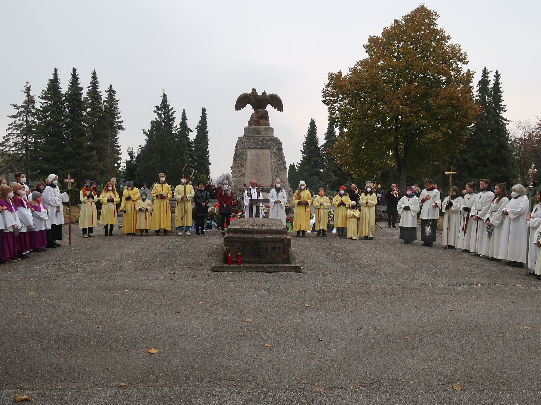 ökumenischen Allerheiligenfeier bei der Aussegnunghalle teil, die von unserer Pfarre gemeinsam mit der evangelischen Pfarre gestaltet wurde. Weiter ging es in einer Prozession zur Gedenkfeier beim Kriegerdenkmal. Nach der Ansprache und gemeinsamen Gebet teilen sich die katholischen Seelsorger*innen der Pfarren auf, und segneten die Gräber.