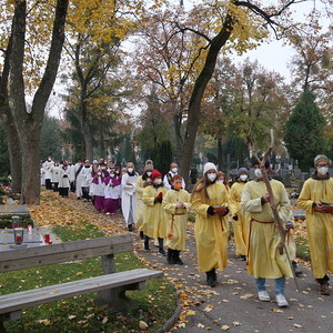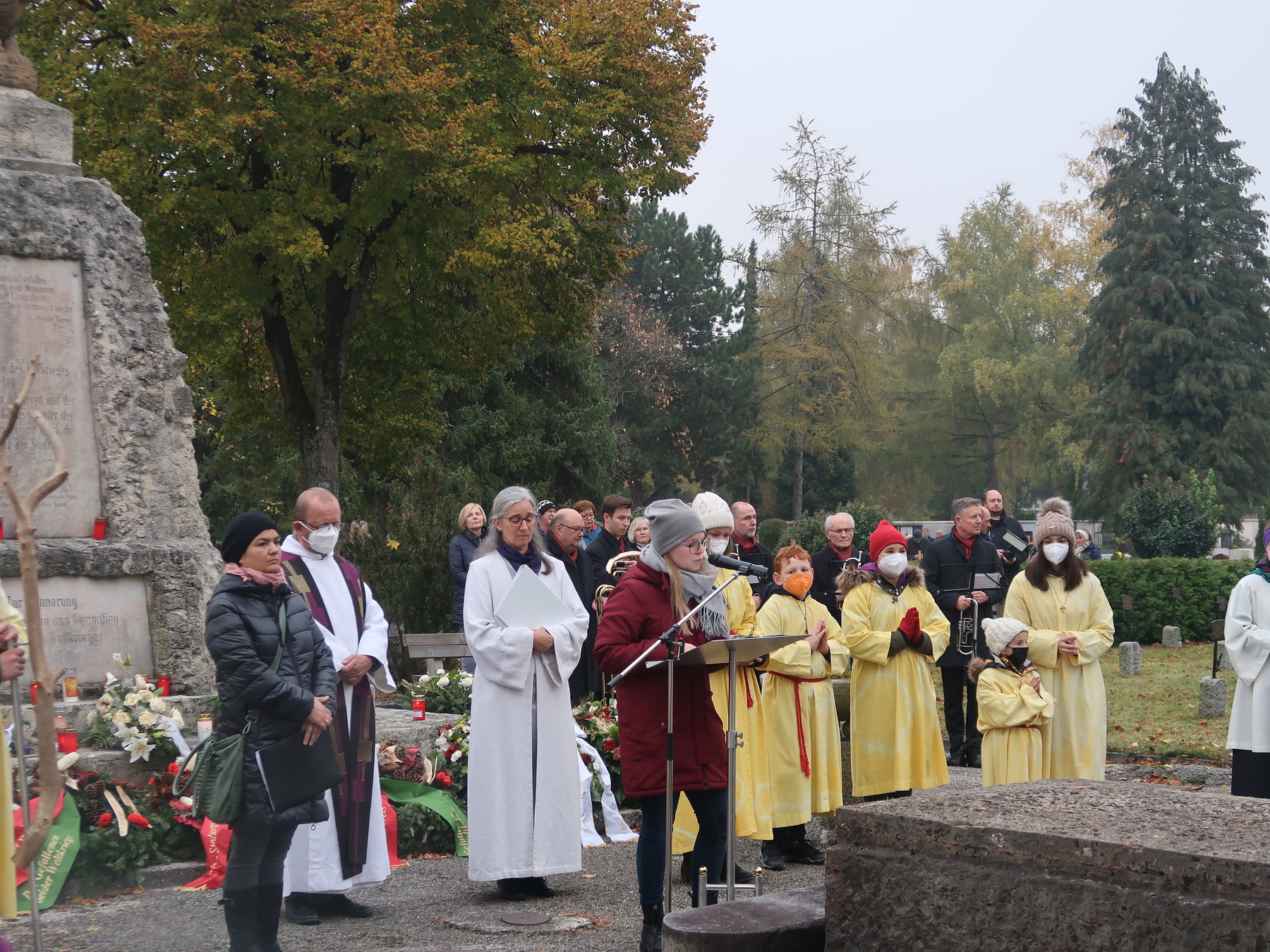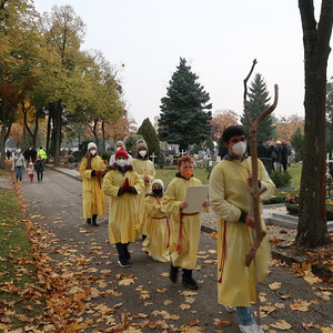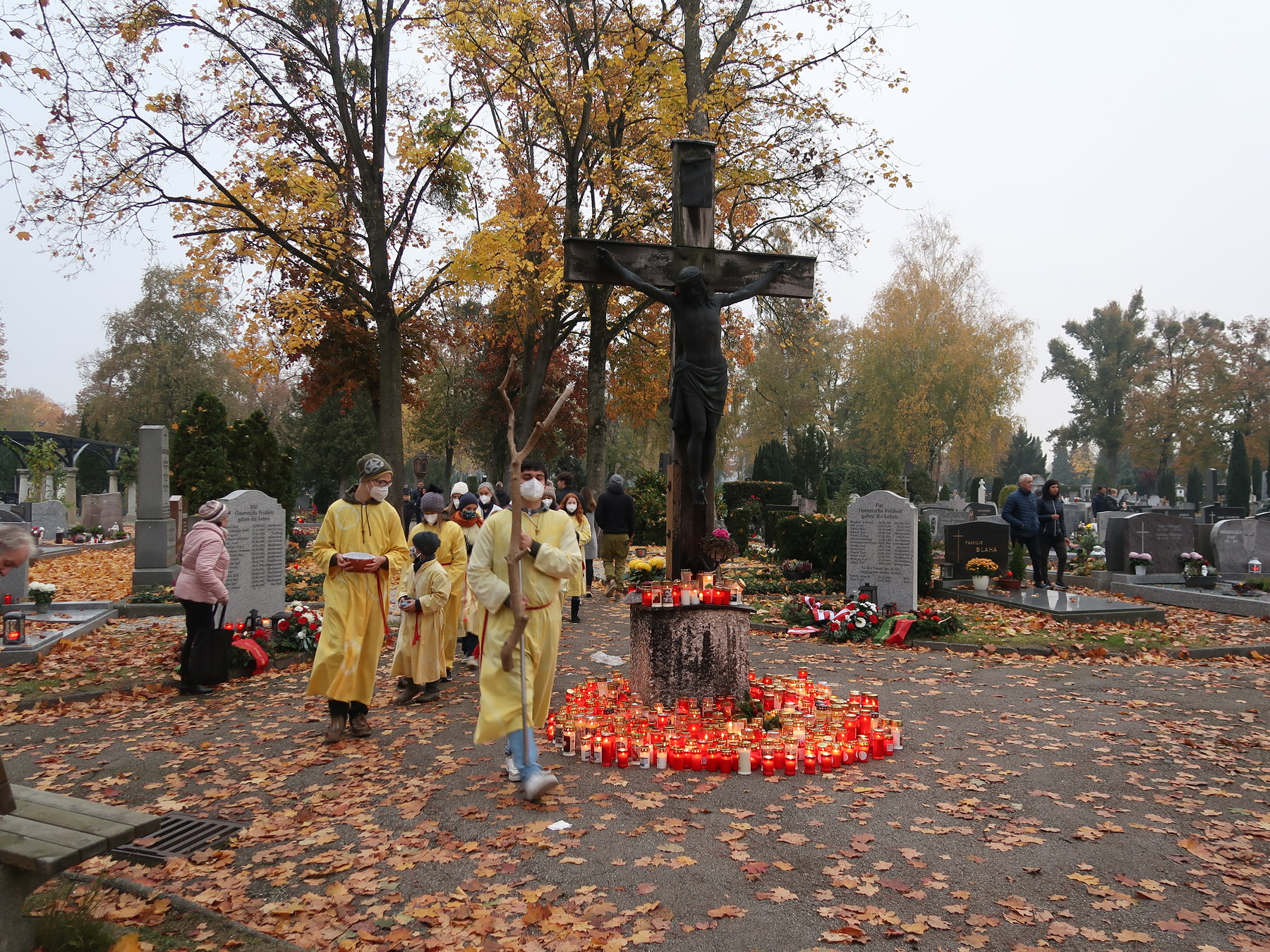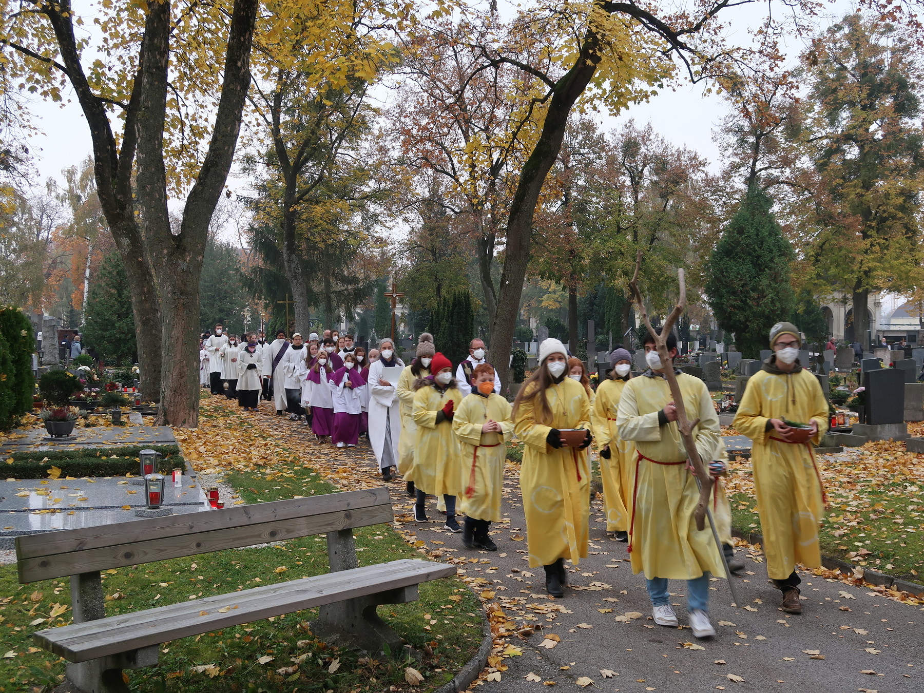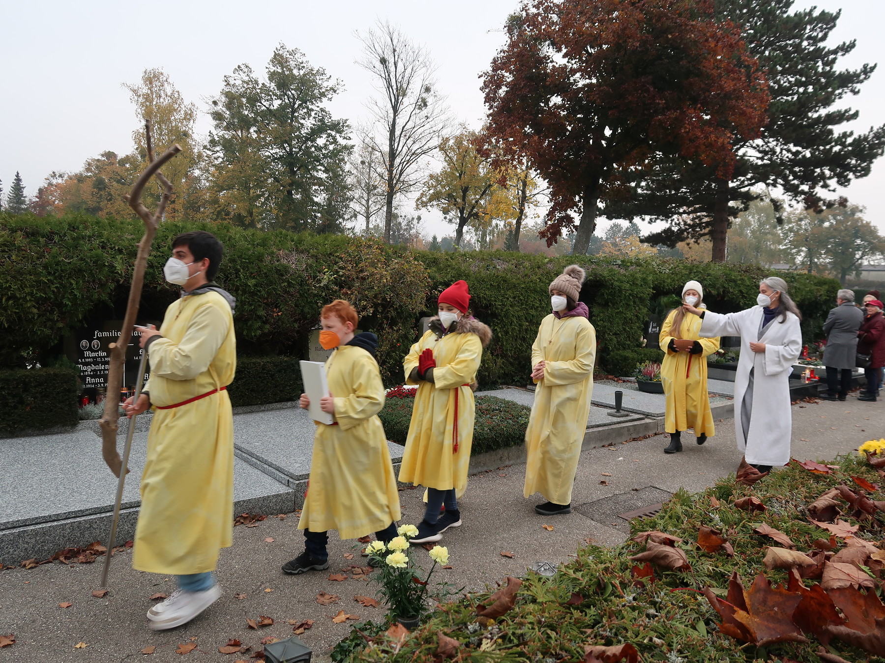 ökumenischen Allerheiligenfeier bei der Aussegnunghalle teil, die von unserer Pfarre gemeinsam mit der evangelischen Pfarre gestaltet wurde. Weiter ging es in einer Prozession zur Gedenkfeier beim Kriegerdenkmal. Nach der Ansprache und gemeinsamen Gebet teilen sich die katholischen Seelsorger*innen der Pfarren auf, und segneten die Gräber.