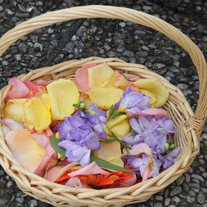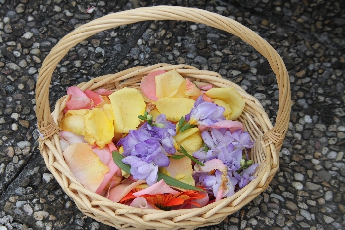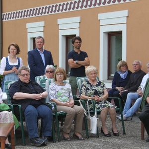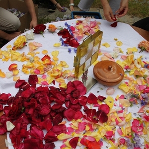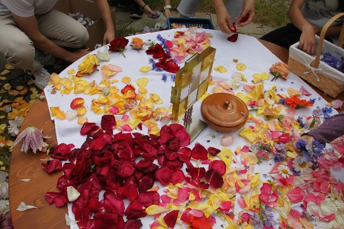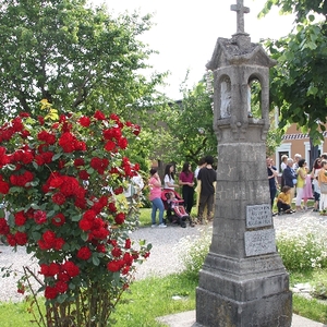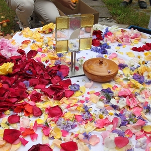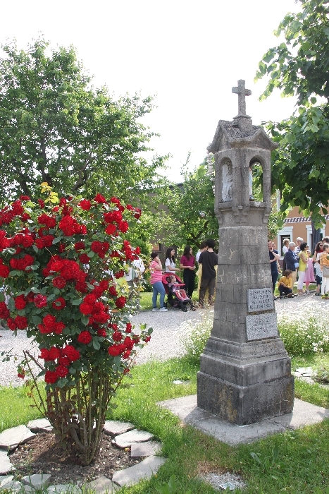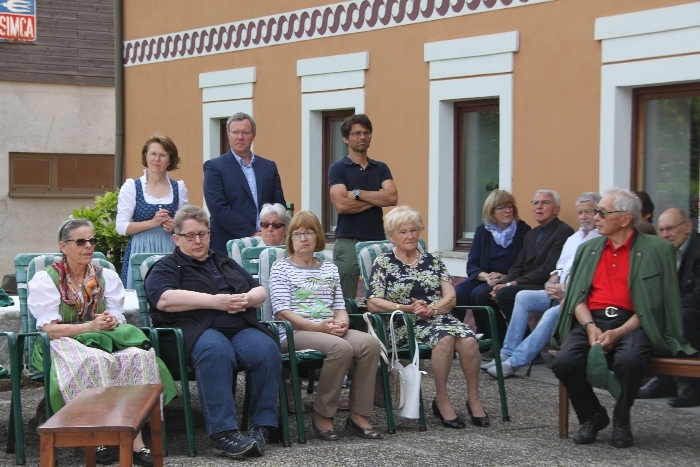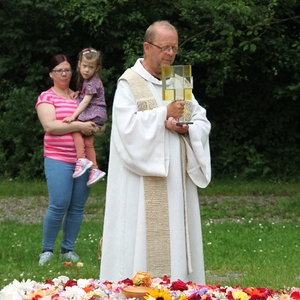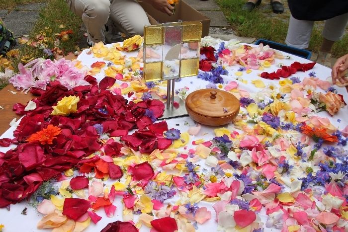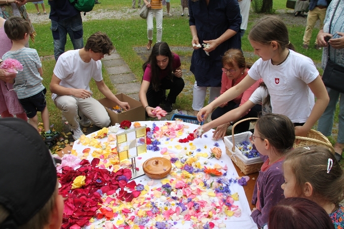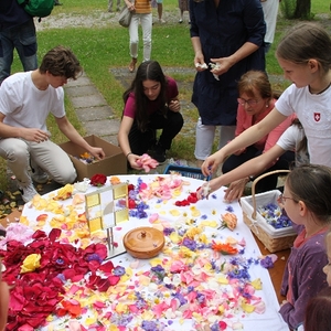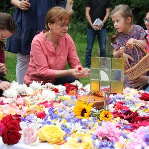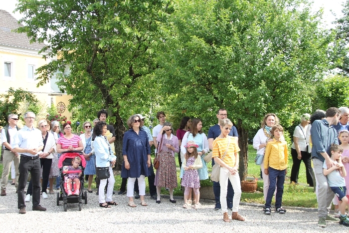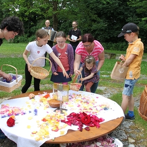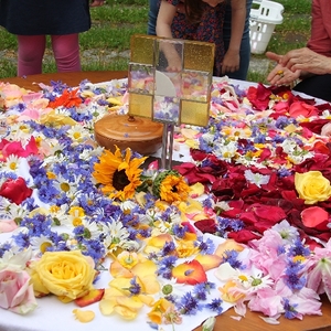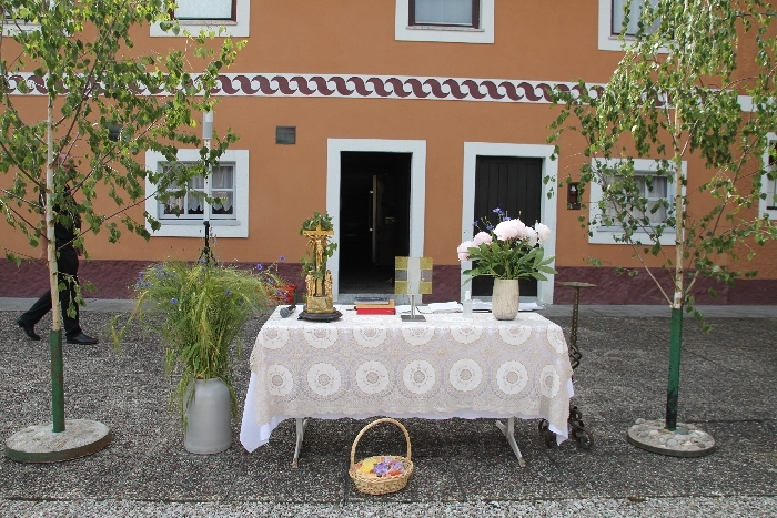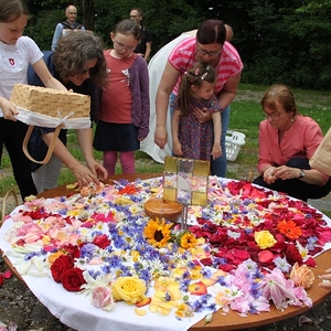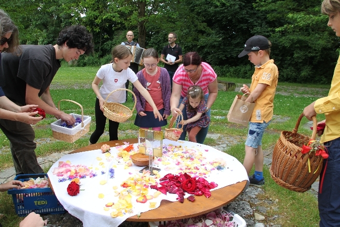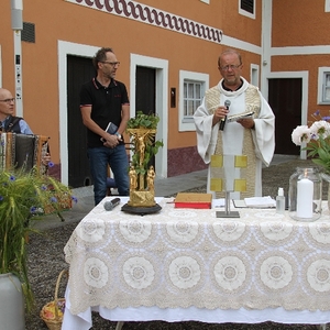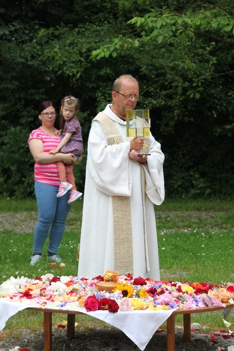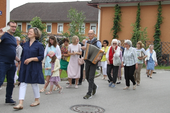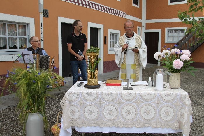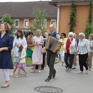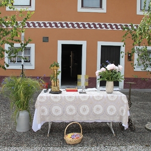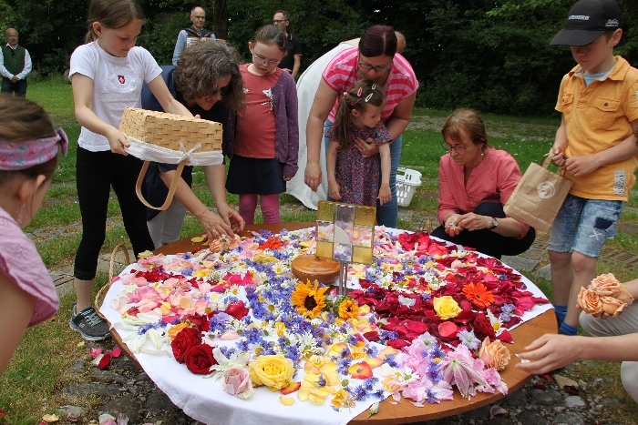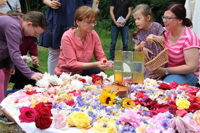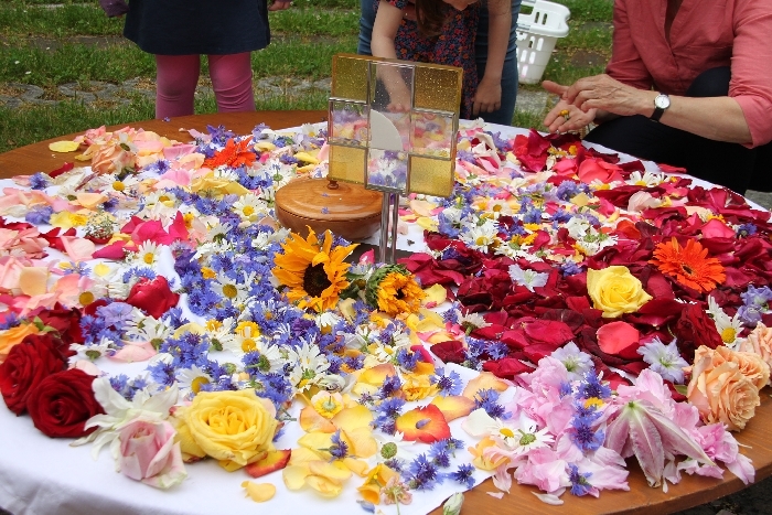 Vom Bauernhof der Familie Plank zogen wir bei Sonnenschein zum Baumkreis vor der Kirche, um noch ein Mandala aus Blumen zu legen und den Segen Gottes für alle Himmelsrichtungen und die dort lebenden Menschen zu erbitten.