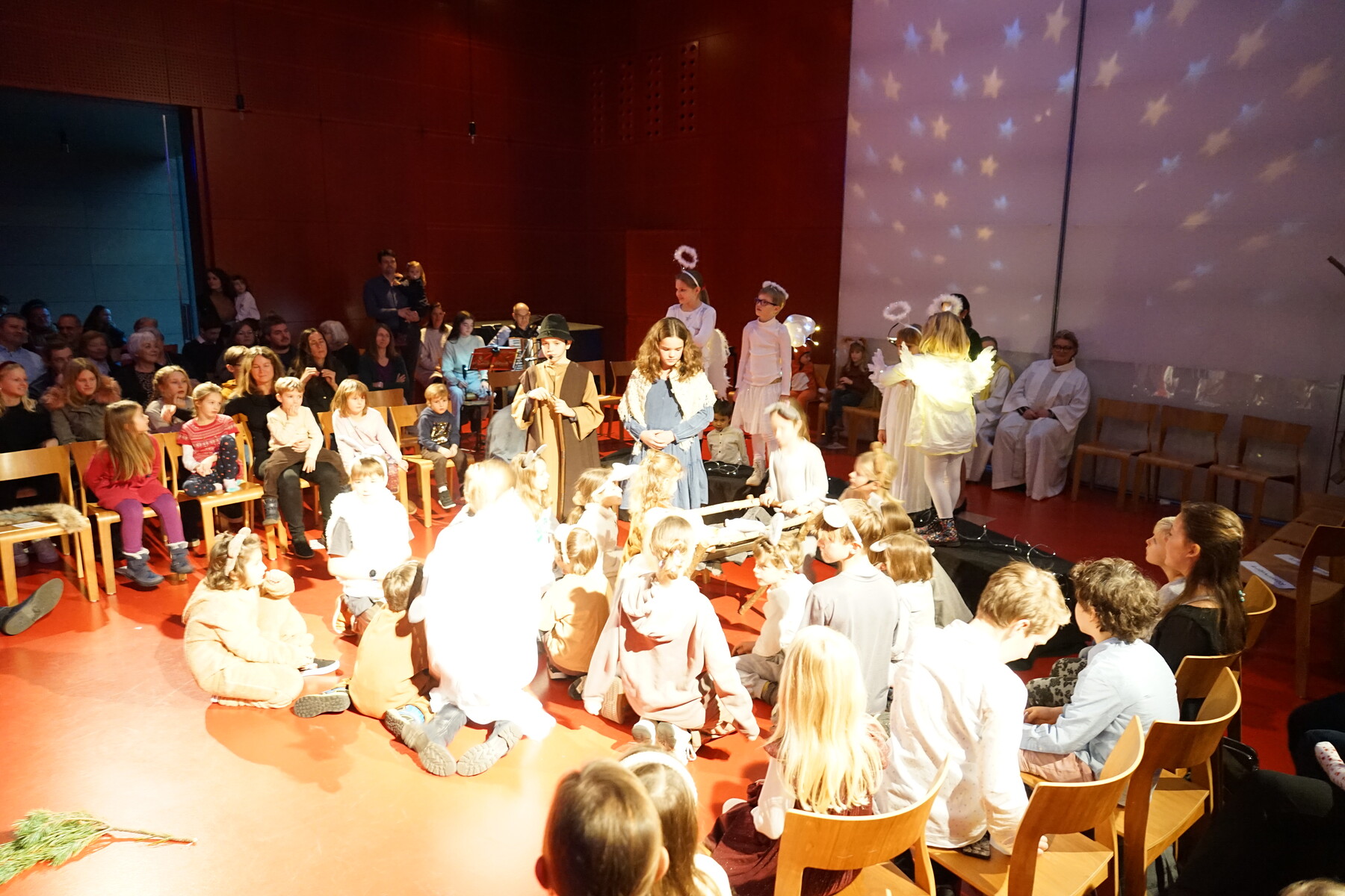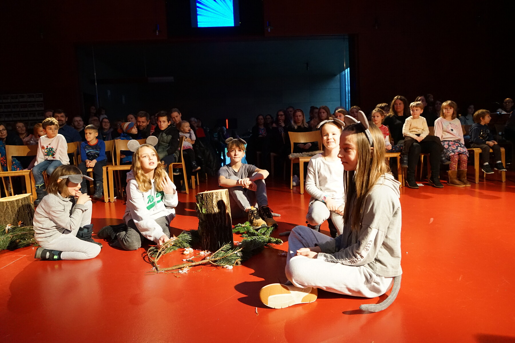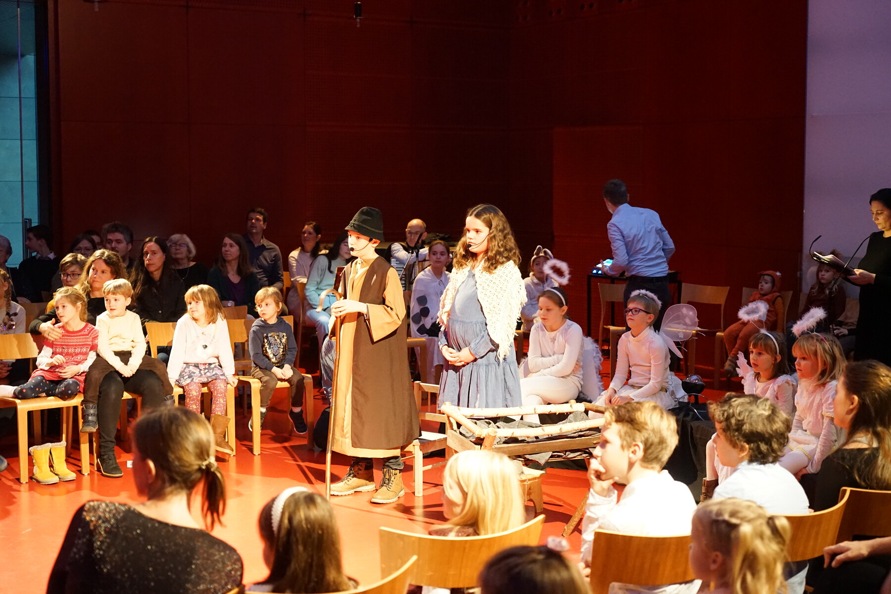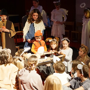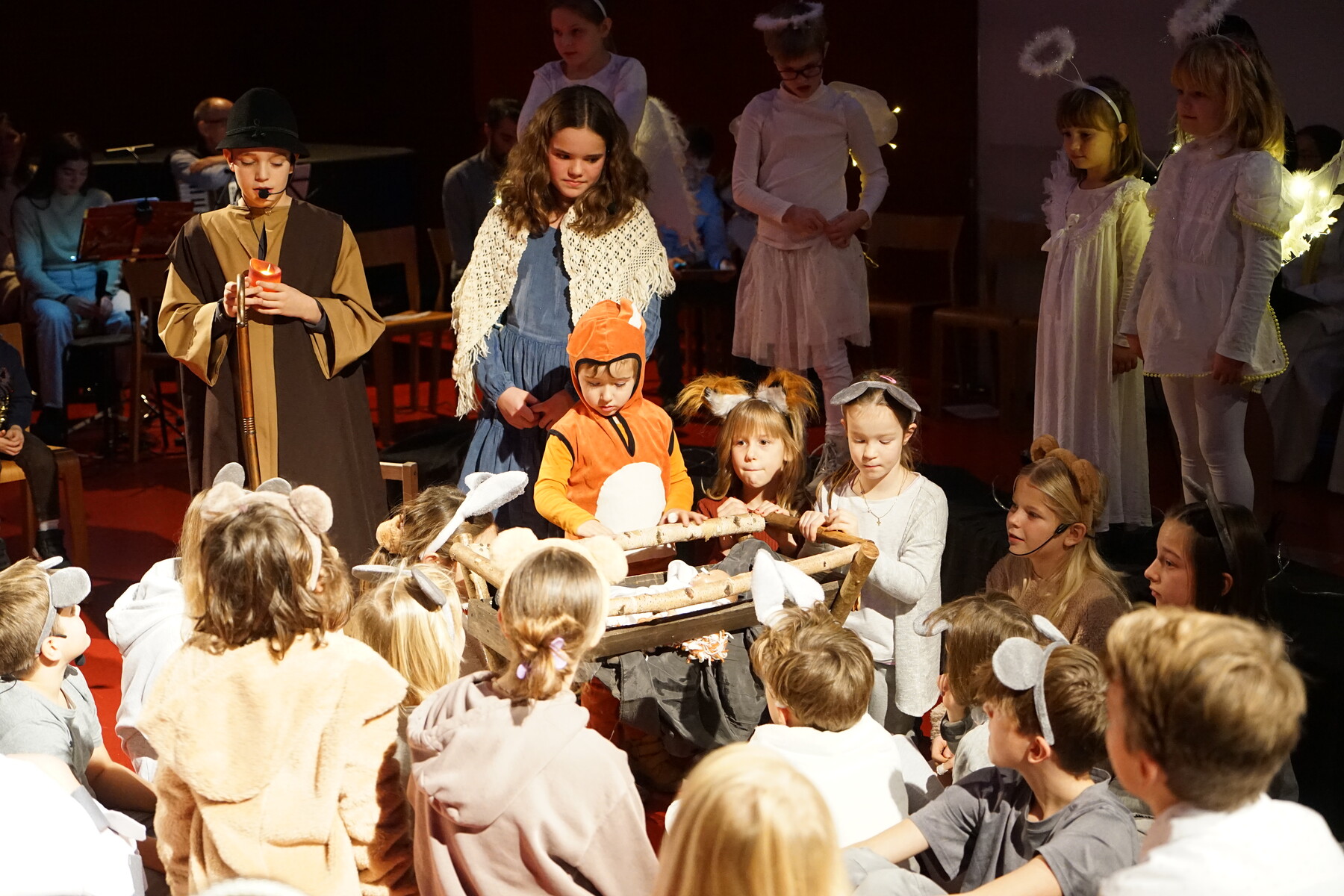 25 Kinder präsentierten die Geschichte von Frederik, einer Maus, die die Not von Maria und Josef im kalten Stall sieht und sofort weiß, dass Hilfe nötig ist. Frederik trommelt die Tiere des Waldes zusammen und gemeinsam machen sie die Geburt des Kindes zu einem Fest der Freude. Ein großes Danke an alle Schauspieler!