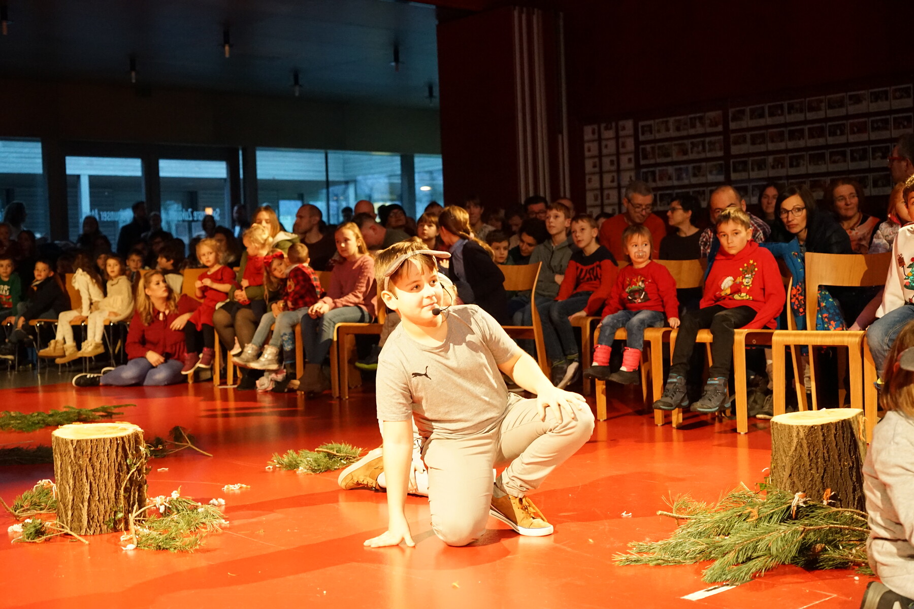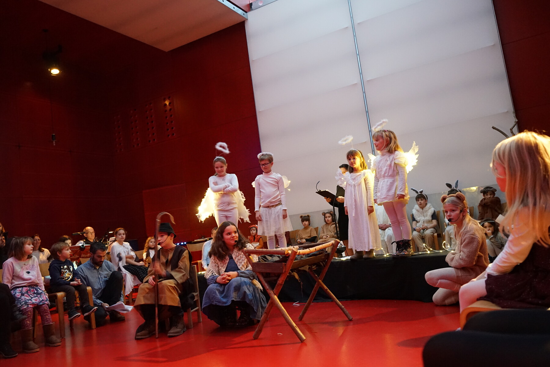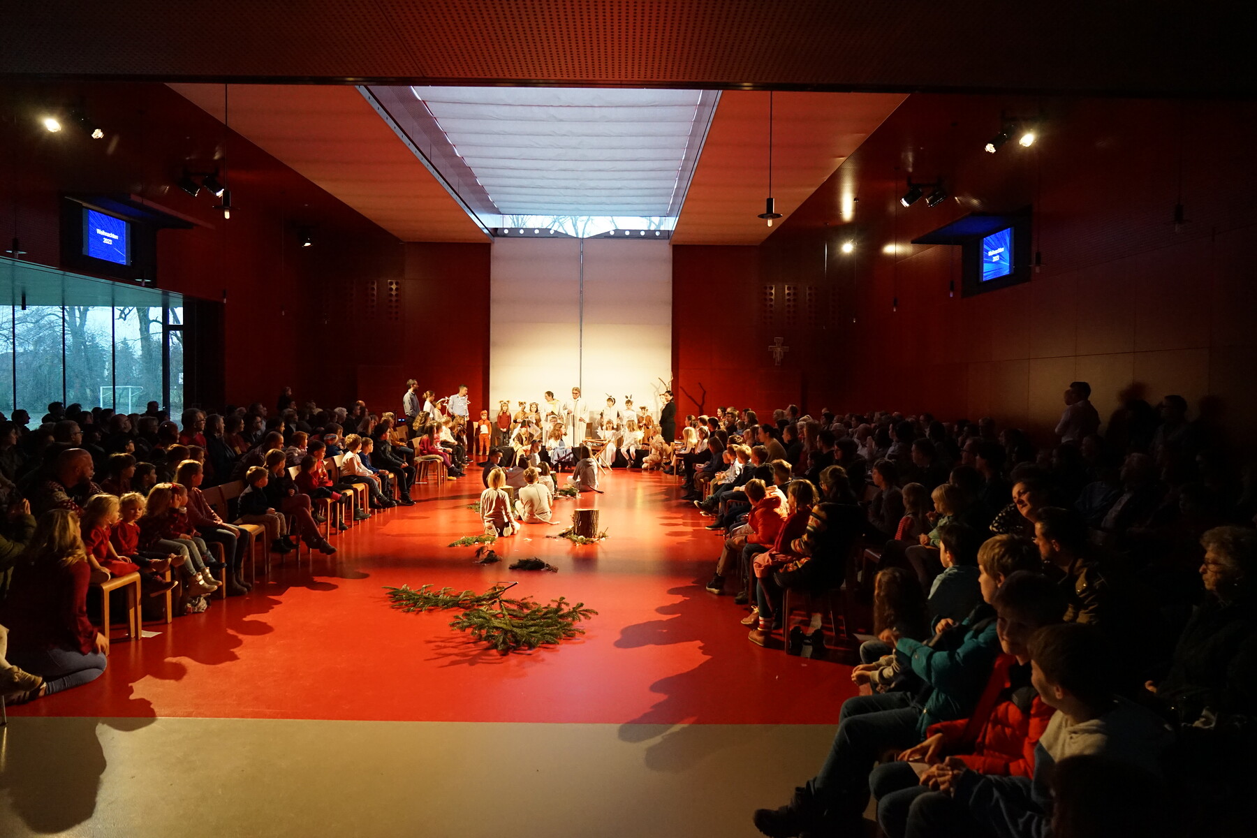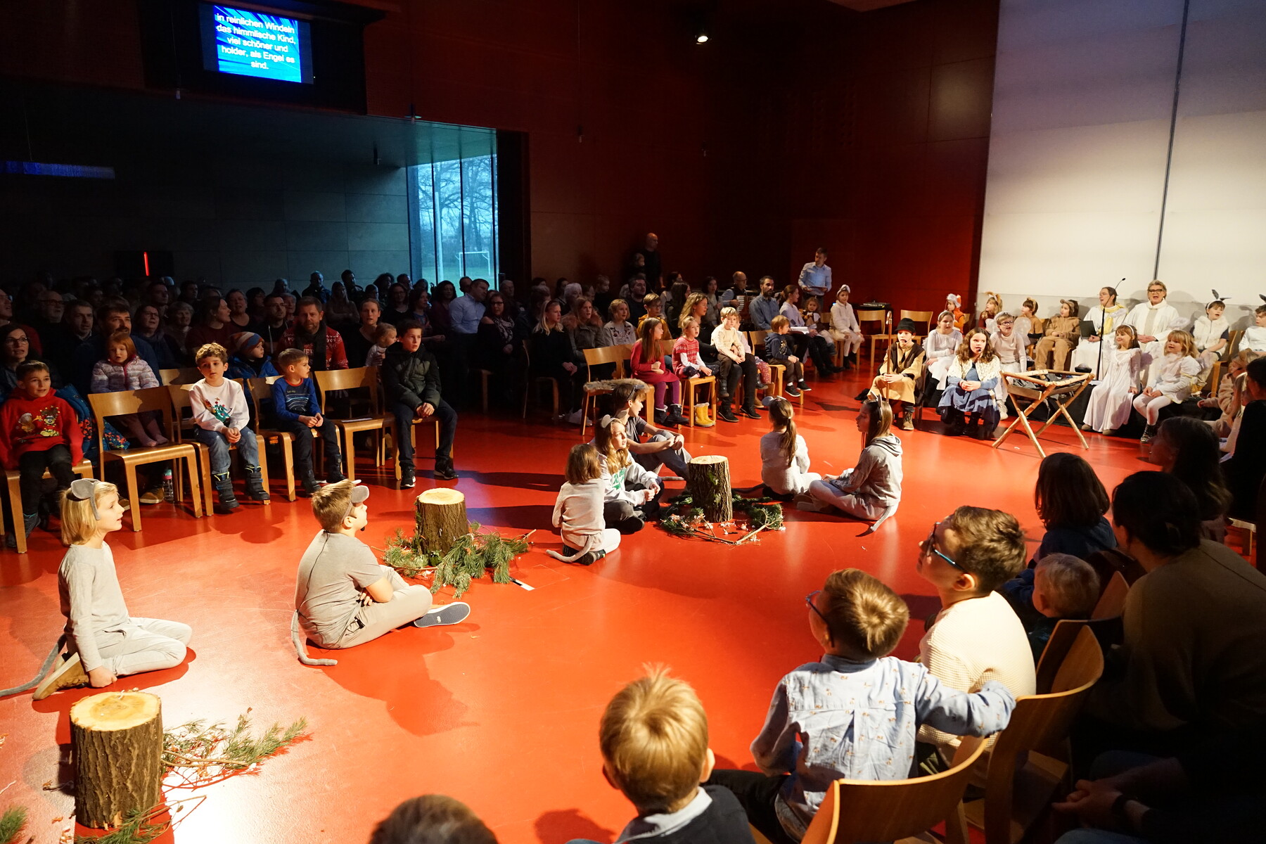 25 Kinder präsentierten die Geschichte von Frederik, einer Maus, die die Not von Maria und Josef im kalten Stall sieht und sofort weiß, dass Hilfe nötig ist. Frederik trommelt die Tiere des Waldes zusammen und gemeinsam machen sie die Geburt des Kindes zu einem Fest der Freude. Ein großes Danke an alle Schauspieler!