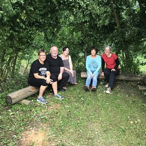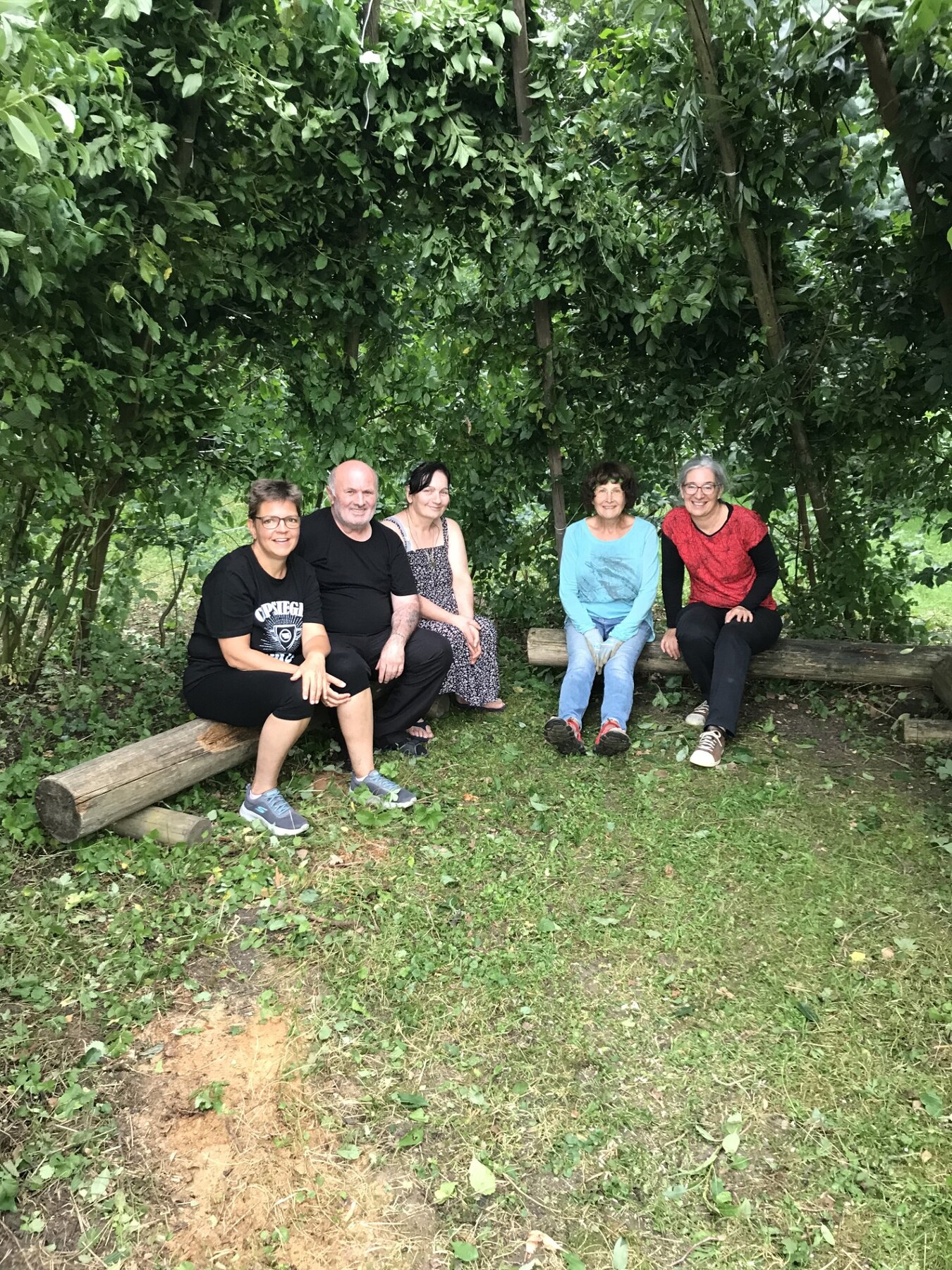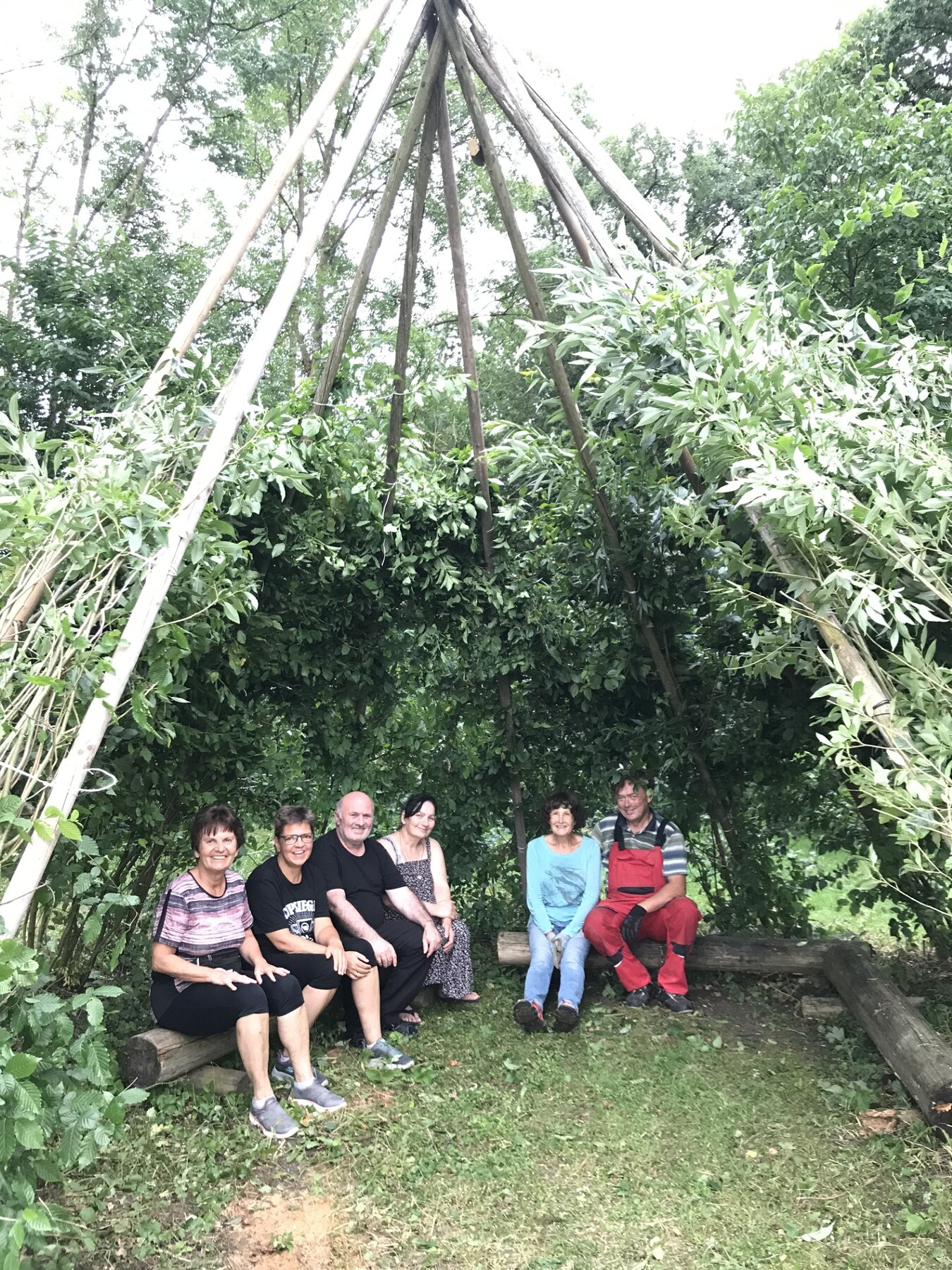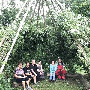 7 x 2 Hände haben das Weidenhaus in unserem Pfarrgarten wieder in Schuss gebracht. Zsaumsitzen- zurückziehen im Schatten der Hainbuchen und Weiden.