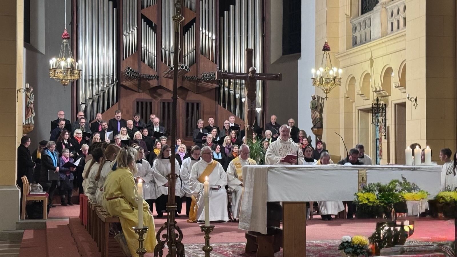 Ein großer gemeinsamer Gottesdienst in der Pfarrkirche Herz Jesu – den feierten wir am Samstag, 8.11.2025. Generalvikar Severin Lederhilger beauftragte den Pfarrvorstand mit der Leitung der Pfarre Raum Wels – Pfarrer Peter Neuhuber, Pastoralvorständin Angelika Gumpenberger-Eckerstorfer und Verwaltungsvorstand Martin Roither. Ein Projektchor unter der Leitung von Martin Kaltenbrunner mit über 50 Sänger:innen inspirierte durch die Musik, ebenso wie Roger Sohler an der Orgel. Menschen aus allen Pfarrgemeinden und pastoralen Knotenpunkten der Pfarre Raum Wels waren gekommen, um dem sichtbaren Start der Pfarre Raum Wels zu feiern, Vertreter:innen bekundeten die Zusammenarbeit mit dem Pfarrvorstand mit Handschlag. Bei der anschließenden Agape kamen die Menschen ins Gespräch.