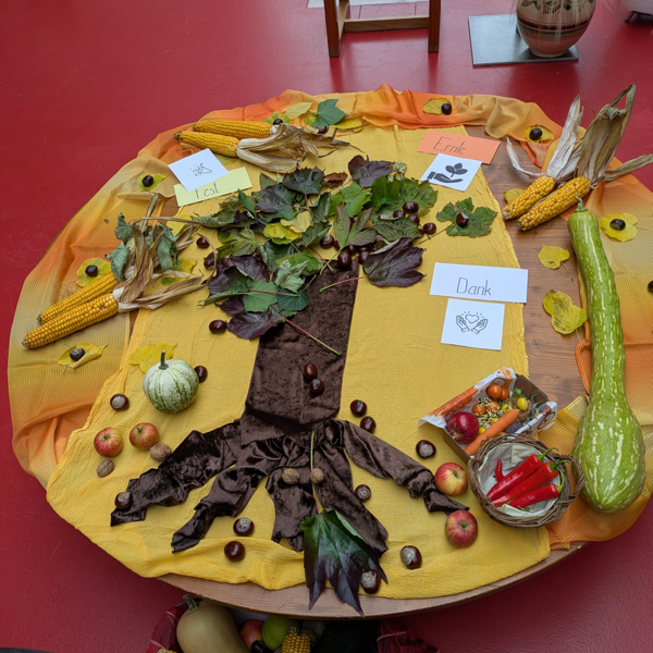 Freudig machte sich Groß und Klein auf den Weg, um das Erntedankfest zu feiern. Viele kamen mit einer eigenen Ernte. Als Zeichen der Freude tanzten wir um den Tisch voll mit den guten Gaben. Weintrauben, Kürbisse, Äpfel und andere gute Dinge waren in den Körbchen, die vor allem die Kinder mithatten und die im Anschluss der Feier gemeinsam geteilt und gegessen wurden. Danke sagen und dankbar sein ist tief mit dem christlichen Glauben verbunden. Dieser Gottesdienst machte deutlich, dass wir für viele Dinge in unserem Leben dankbar sein dürfen. Allem voran für die lieben Menschen, die uns umgeben.