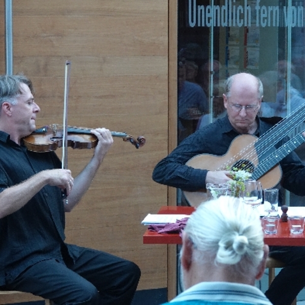Ein wirklich warmer Sommerabend, Schrammelmusik vom Duo Alt-Wien und passende Texte - gelesen von Thomas Hochreiter - dazu eine hervorragende Jause und gute Weine! Heurigenstimmung pur!