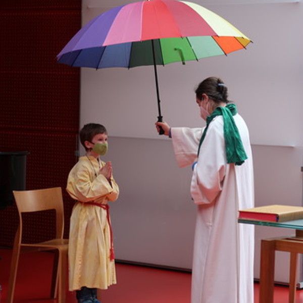 Den ersten Gottesdienst nach langer Pause feierten wir mit großem Abstand. Nach Psalm 91 "Wer unter dem Schirm Gottes sitzt, der kann sich in seinem Schatten ausrasten" segneten wir die Kinder und Eltern.