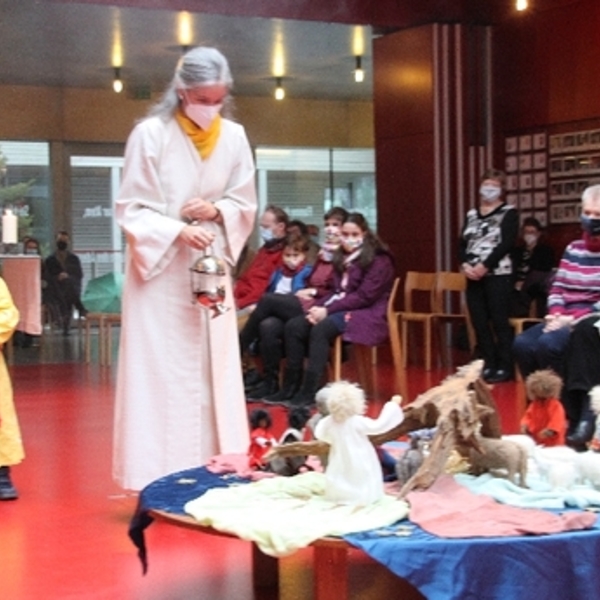 Wie die Hirtinnen und Hirten auf dem Feld, brachten fünf Personen stellvertretend Lichter zur Krippe für all jene, die an diesem Weihnachtsfest in Sorge sind. Die Pfarrleiterin trug in berührender Weise das Jesuskind herein zur Krippe. Familie Helm gestaltete die Musik wunderbar von Stille Nacht über All I want for Christmas und Mary did you know.