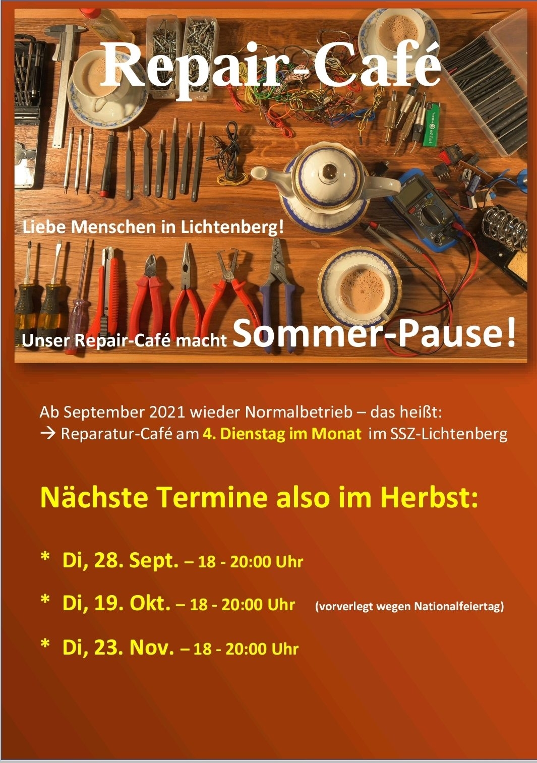 Ab September 2021 wieder Normalbetrieb – das heißt: → Reparatur-Café am 4. Dienstag im Monat im SSZ-Lichtenberg.