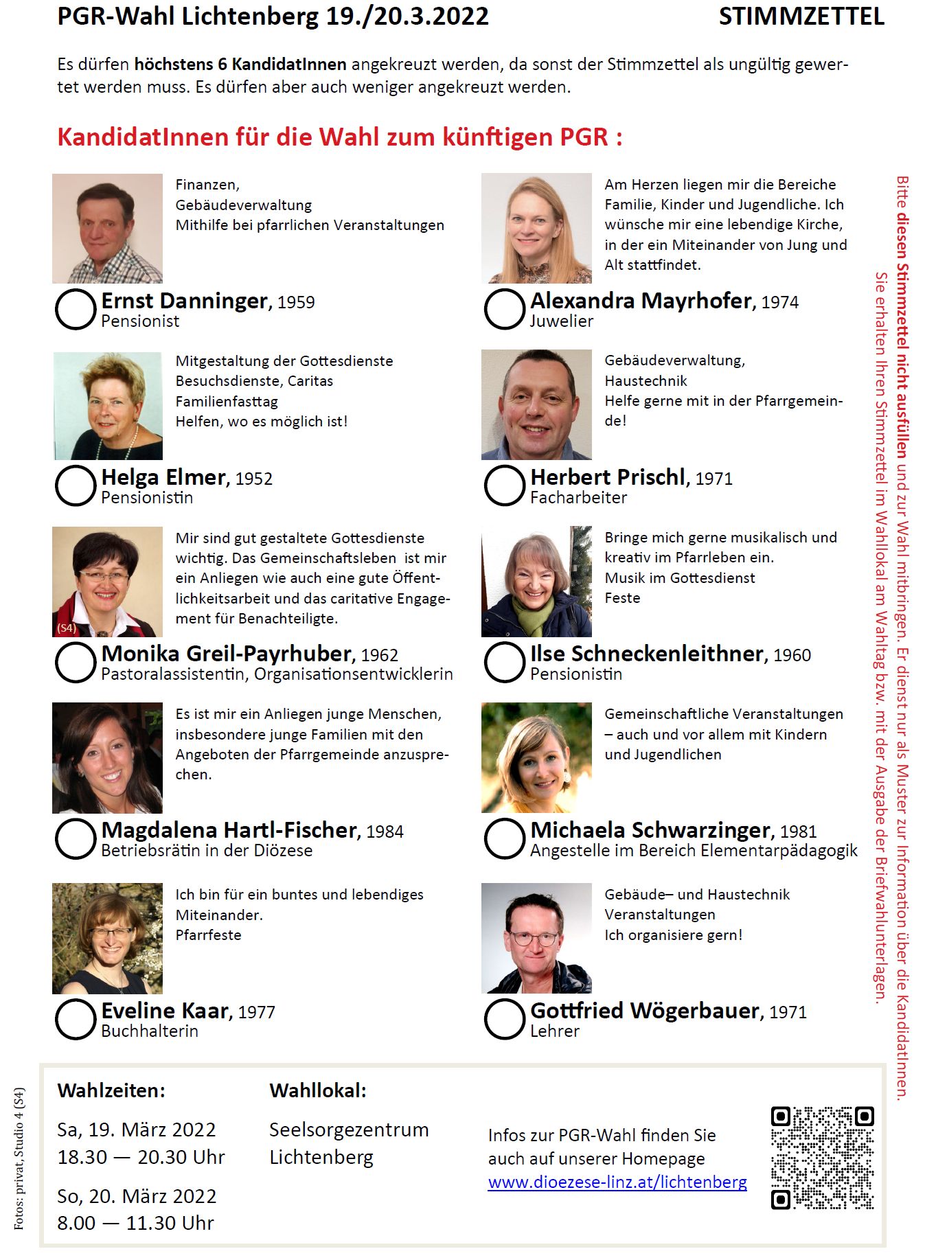 >> Briefwahlkuverts und Stimmzettel können ab Samstag, 5.3., nach den Gottesdiensten in der Sakristei oder im Büro des Seelsorgezentrums Lichtenberg abgeholt werden.