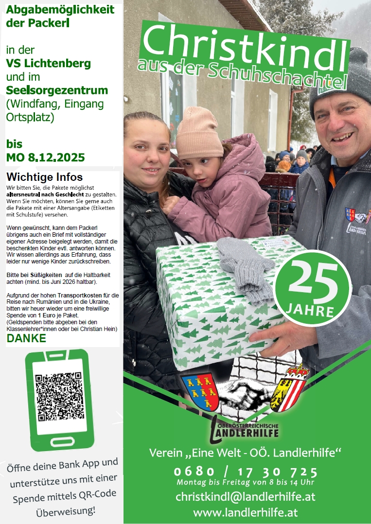 Die Christkindl-Packerl für Kinder aus den ehemaligen Landlergebieten in der Ukraine und in Rumänien können bis MO 8.12.2025 abgegeben werden (Seelsorgezentrum Lichtenberg, VS Lichtenberg).