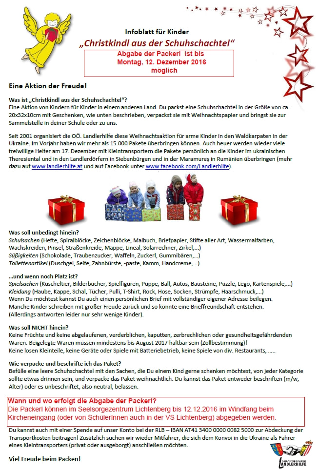 Volksschule Lichtenberg und Pfarre laden ein, sich an dieser Aktion der Landlerhilfe zu beteiligen