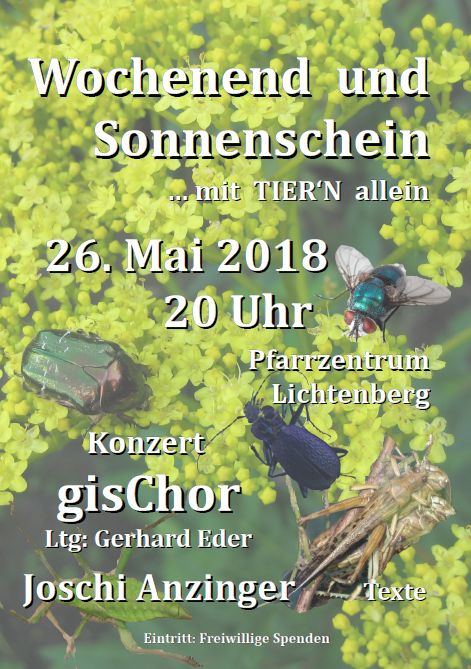 Der gisChor unter der Leitung von Gerhard Eder lädt sehr herzlich zu einem frühsommerlichen Konzert am Samstag, 26.5.2018, um 20:00 Uhr in das Pfarrzentrum Lichtenberg ein.