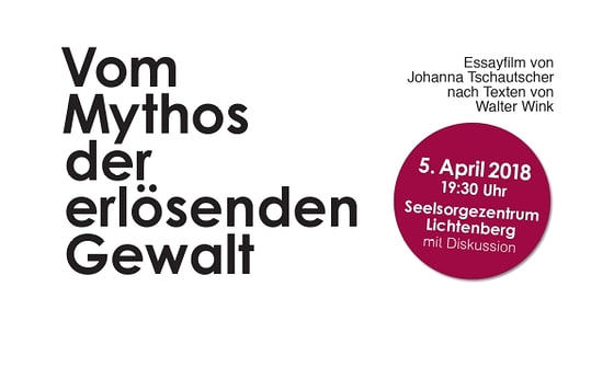Filmvorführung "Vom Mythos der erlösenden Gewalt" Essayfilm von Johanna Tschautscher nach Texten von Walter Wink. Mit Diskussion. DO 5.4.2018, Seelsorgezenthrum Lichtenberg, Beginn 19.30 Uhr mehr: Filmvorführung
