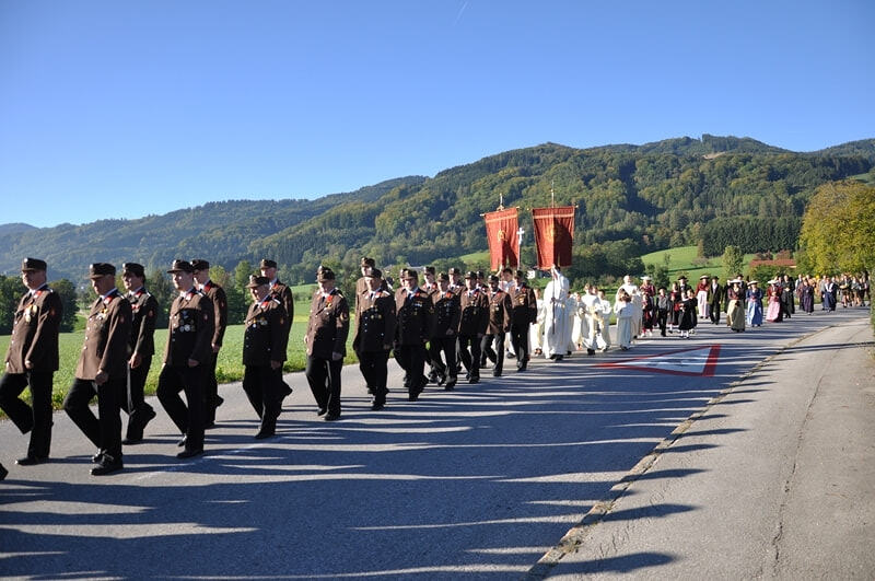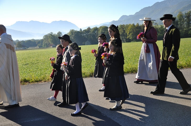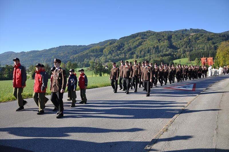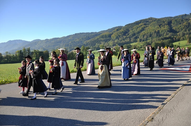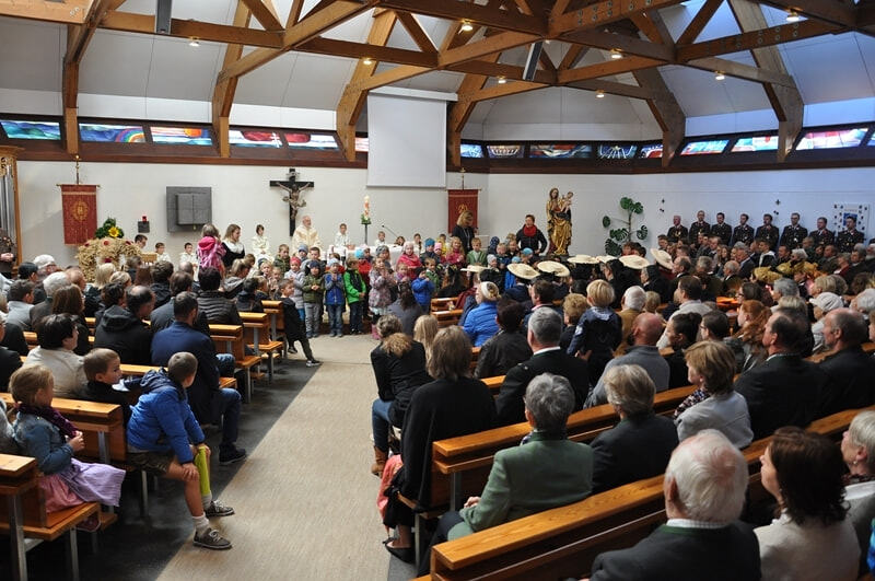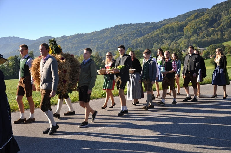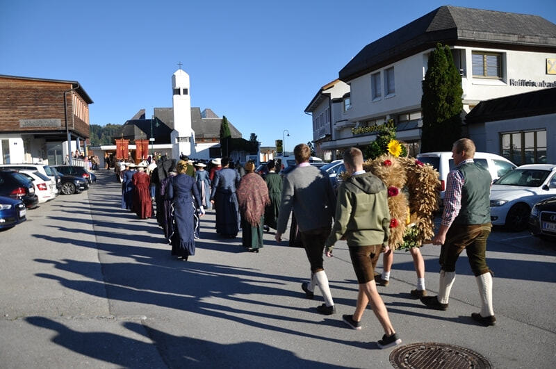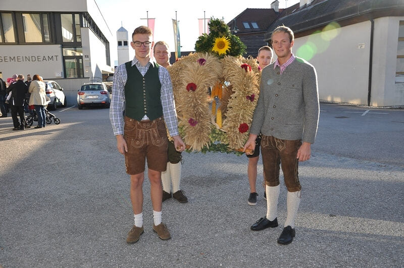 Die Landjugend schmückte die traditionelle Erntekrone und trug diese zum Altar. Heuer zelebrierte Pater Markus Zimmermann die heilige Messe.