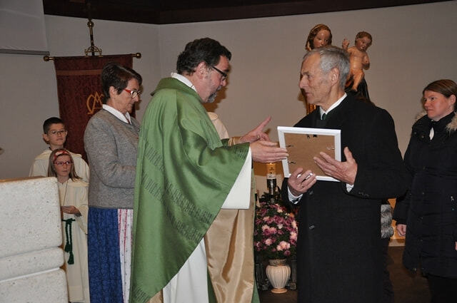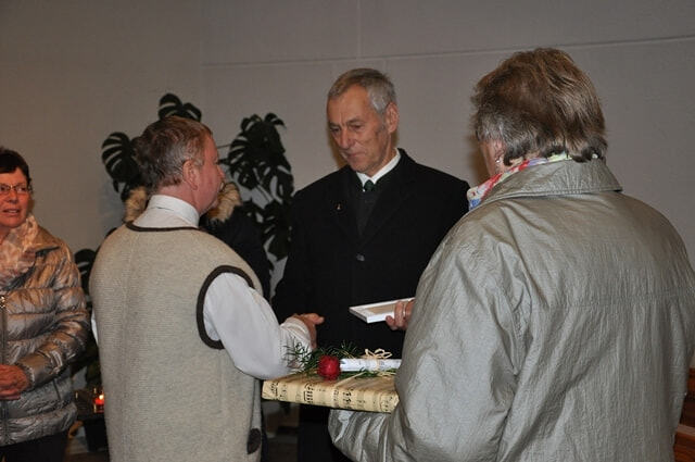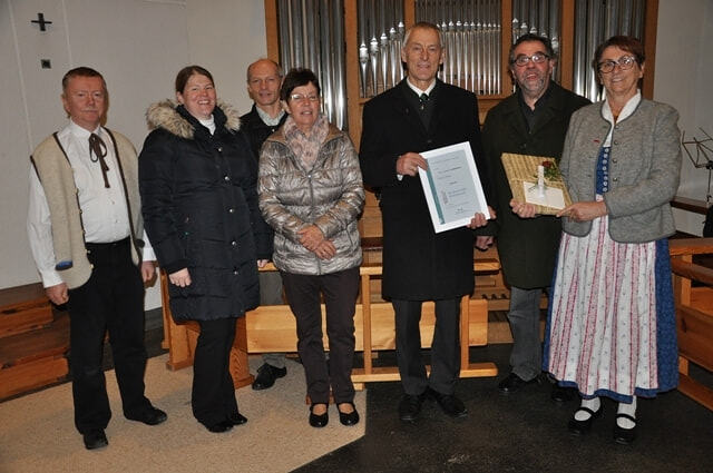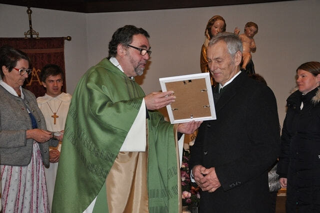 Vor einigen Tagen hat Leopold seinen 70. Geburtstag gefeiert. Das ist ein Anlass, uns bei ihm zu bedanken und diesen Dienst zu würdigen. Deshalb verleiht ihm das Diözesanreferat für Kirchenmusik für langjährige Tätigkeit als Organist die silberne Nadel. Im Namen der ganzen Pfarrgemeinde bedanken wir uns bei ihm mit einem herzlichen „Vergelts Gott“. Möge Gott ihm noch lange Gesundheit schenken, damit er noch lange Freude beim Spielen hat und viele Gottesdienste an der Orgel begleiten kann.