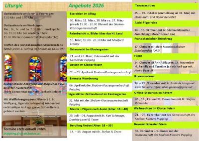 Informieren Sie sich über das reichhaltige Jahresprogramm 2026 des Shalomklosters der Franziskaner in Pupping, OÖ