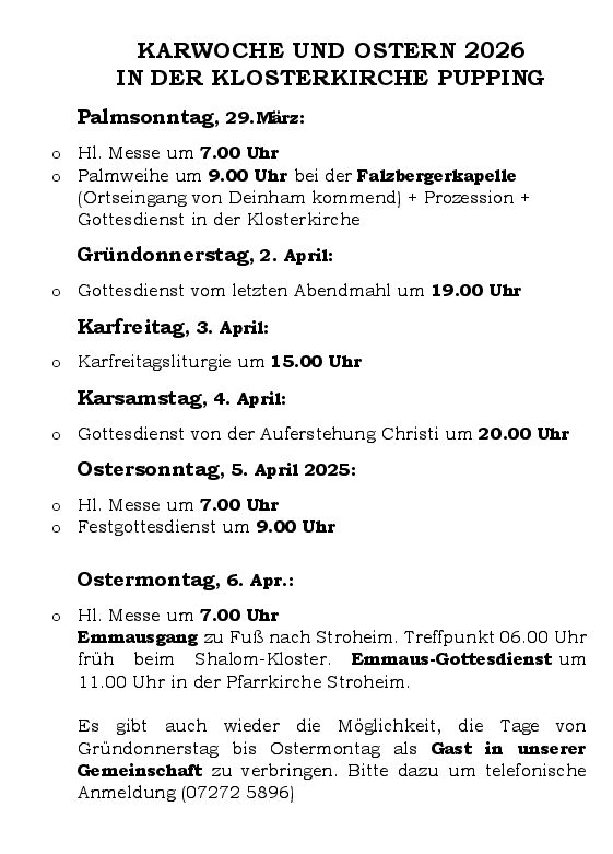 Termine in der Klosterkirche Pupping ab Palmsonntag, 29. 3. 2026