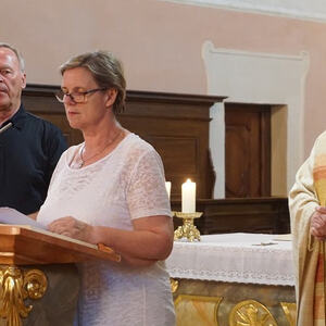 Der Pfarrprovisor der Pfarre Maria Scharten KonsR Mag. Josef Etzlstorfer erinnert zu Beginn des Gottesdienstes an die Tagesheilige Hemma von Gurk.