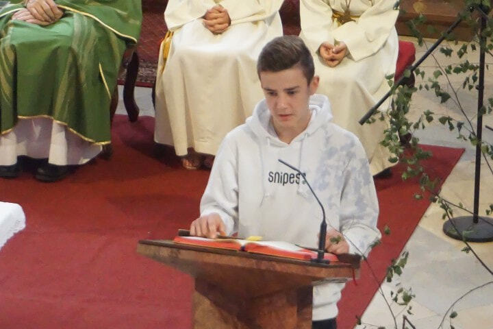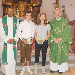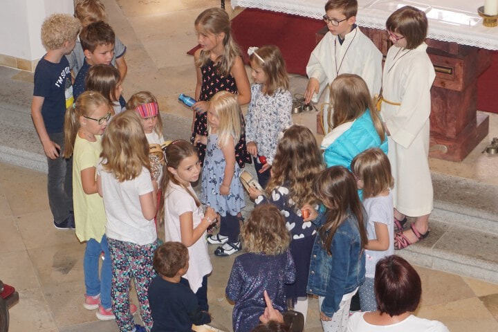 Sophie und Daniel ministrieren seit ihrer Erstkommunion. sie bekommen ein Geschenk von der Pfarre und ein Kreuz, das sie während ihres Dienstes immer begleitet hat.