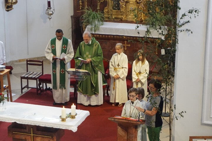 "Jesus, ich bau auf dich" erklingt es im Kirchenraum, begleitet von Kinderstimmen, Rasseln, Triangeln und Orchesterinstrumenten.