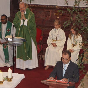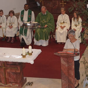 Der Bischofsvikar Willi Vieböck, der Pfarradministrator Dr. Paulinus Anaedu, die Instrumentalgruppe unter der Leitung von Barbara Knogler, die Religionslehrerin Birgitta Aichinger und Pfarrverantwortliche der Pfarre Aschach.