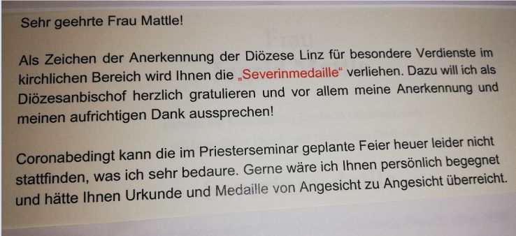 Die Severin-Medaille ist das Dankeschön der Diözesanleitung, das "Ehrenzeichen als Dank und Anerkennung für langjähriges Engagement in der Pfarre und über die Pfarrgrenzen hinaus".