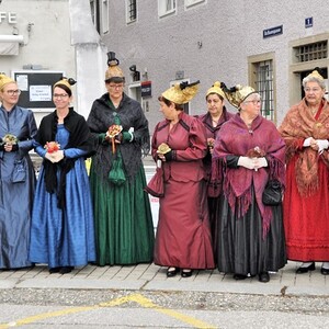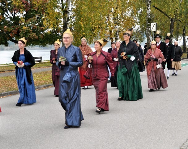 In Begleitung von Musik, Feuerwehr, Trachten- und Goldhaubengruppen sowie von Kindern der Aschacher Volksschule wurden die Glocken auf einem geschmückten Wagen zum Pfarrplatz gefahren.