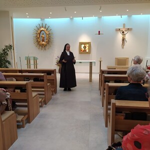 Pünktlich um16:00 erwartete uns die Generaloberin des Ordens, Sr. Michaela Pfeiffer, vor dem neu renovierten Gebäude, welches u.a. eine kleine, feine Wellnessoase, Therapieräume, Gästezimmer, ein Selbstbedienungscafe und eine neu gestaltete Kapelle beherbergt. Dort wo noch vor wenigen Jahren gespeist wurde, befindet sich jetzt die kleine Kirche, in der jeden Tag Hl. Messe gefeiert wird und die auch einen Rückzugsort für die doch schon eher betagte Schwesterngemeinschaft bietet.