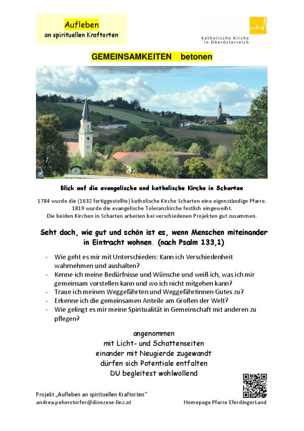 Mit Blick auf die evangelische und katholische Kirche in Scharten stelle ich mir Fragen zu Gemeinsamkeiten und Verschiedenheit und über meine Art Spiritualität zu leben.