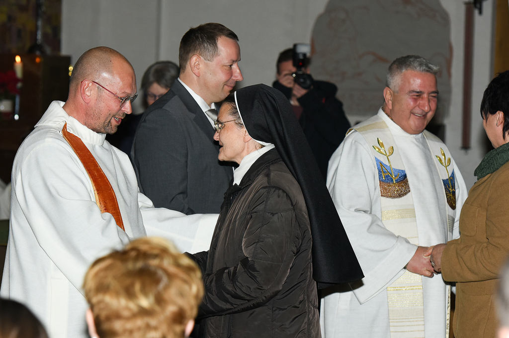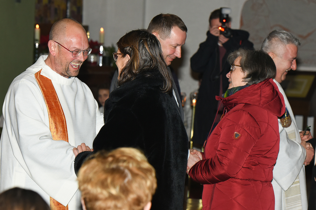 Liturgisch integriert folgte nach den ersten Worten an die Gemeinde der Handschlag von Sprecher:innen der Seelsorgeteams aller Gemeinden und Vertreter:innen der weiteren pastoralen Einrichtungen der neuen Pfarre, womit sie die Zusammenarbeit mit dem neuen Pfarrvorstand bekundeten.