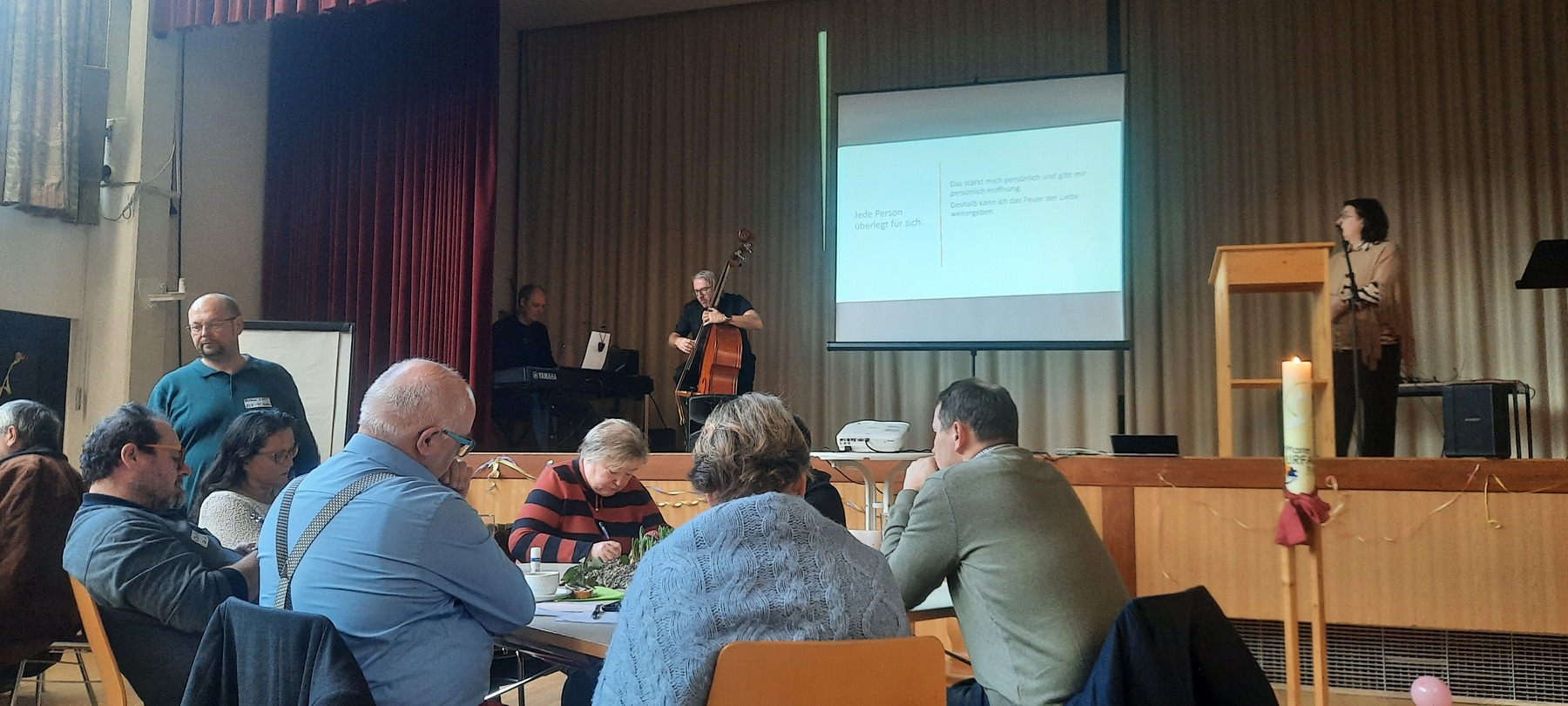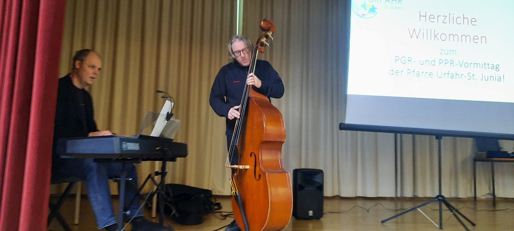 Sehr zum Gelingen des Vormittags trug die swingende groovige und improvisiert auf den Augenblick gespielte Life-Musik des Kontrabassisten Didi Stimmeder und des Pianisten Robert Holzer bei; zu Beginn, am Ende und zu den Nachdenkphasen schlichen sich immer dezent ihre musikalischen Ideen ein. Als Abschluss des Mitagslobes erklang dann sogar noch ein neu für die Pfarre Urfahr geschriebenes Junia-Lied, bevor sich dann alle im Stüberl „des Hl. Geistes“ ausreichend mit Speiss und Trank auch leiblich wieder laben konnten.