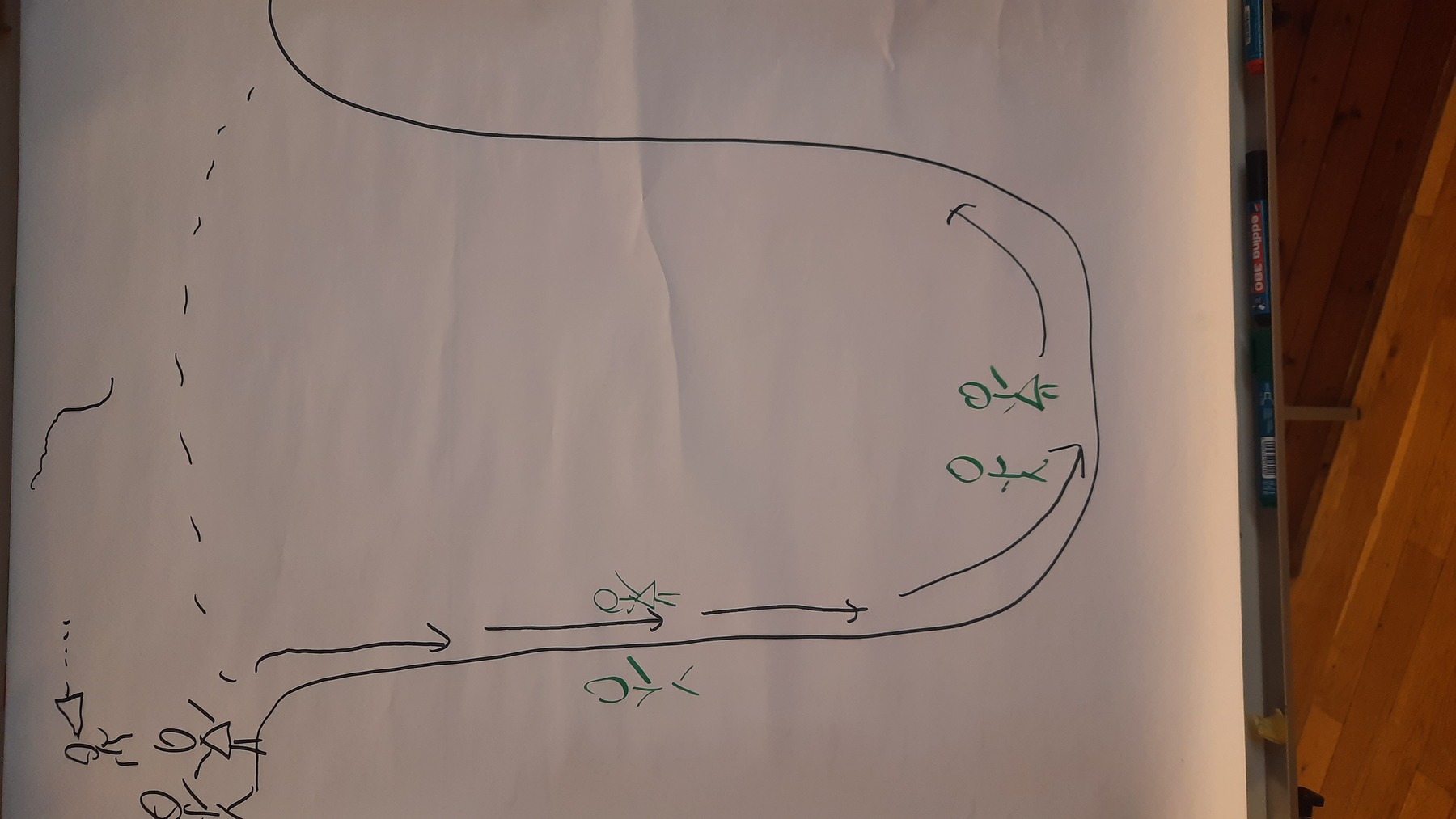 Methodisch wurden die Teilnehmer*innen des Tages eingeladen, sich im Raum zwischen den Polen Jerusalem und Babel aufzustellen und argumentativ und situativ einzufühlen in den gewählten geistigen Platz. Fast alle Teilnehmer*innen stellten sich dann auch in die Hälfte von Babylon, allerdings verteilt von der Mitte bis 100% Babel.