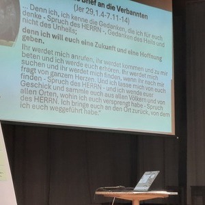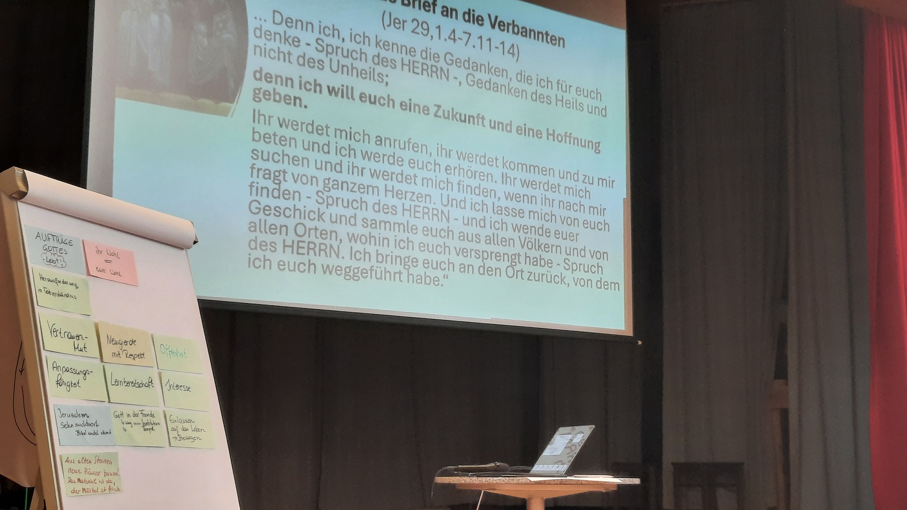 Der Profet Jeremia rät dennoch: Baut euch Häuser im fremden Land, pflanzt Gärten an und gründet Familien, integriert euch! Und wörtlich auch: "Sorgt euch um das Wohl der Stadt und betet für sie, denn in ihrem Wohl liegt euer Wohl!"
