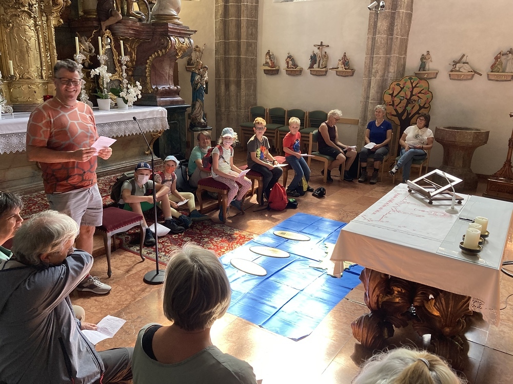Bibelstellen aus der Offenbarung des Johannes luden zum gemeinsamen Nachdenken ein. Eine kurze Rast mit einem kleinen Imbiss luden zur Stärkung ein. Der Abschluss der Pilgerwanderung erfolgte in der Pfarre Münzkirchen. Begegnung, Kennen lernen, gemeinsame Gespräche und Fröhlichkeit stärkten die Gruppe. Das gemeinsame Gehen, Ankommen, Feiern und Weggehen gab der Pilgerrunde und damit der Vision zur neuen Pfarre, ein Gefühl der Zusammengehörigkeit.