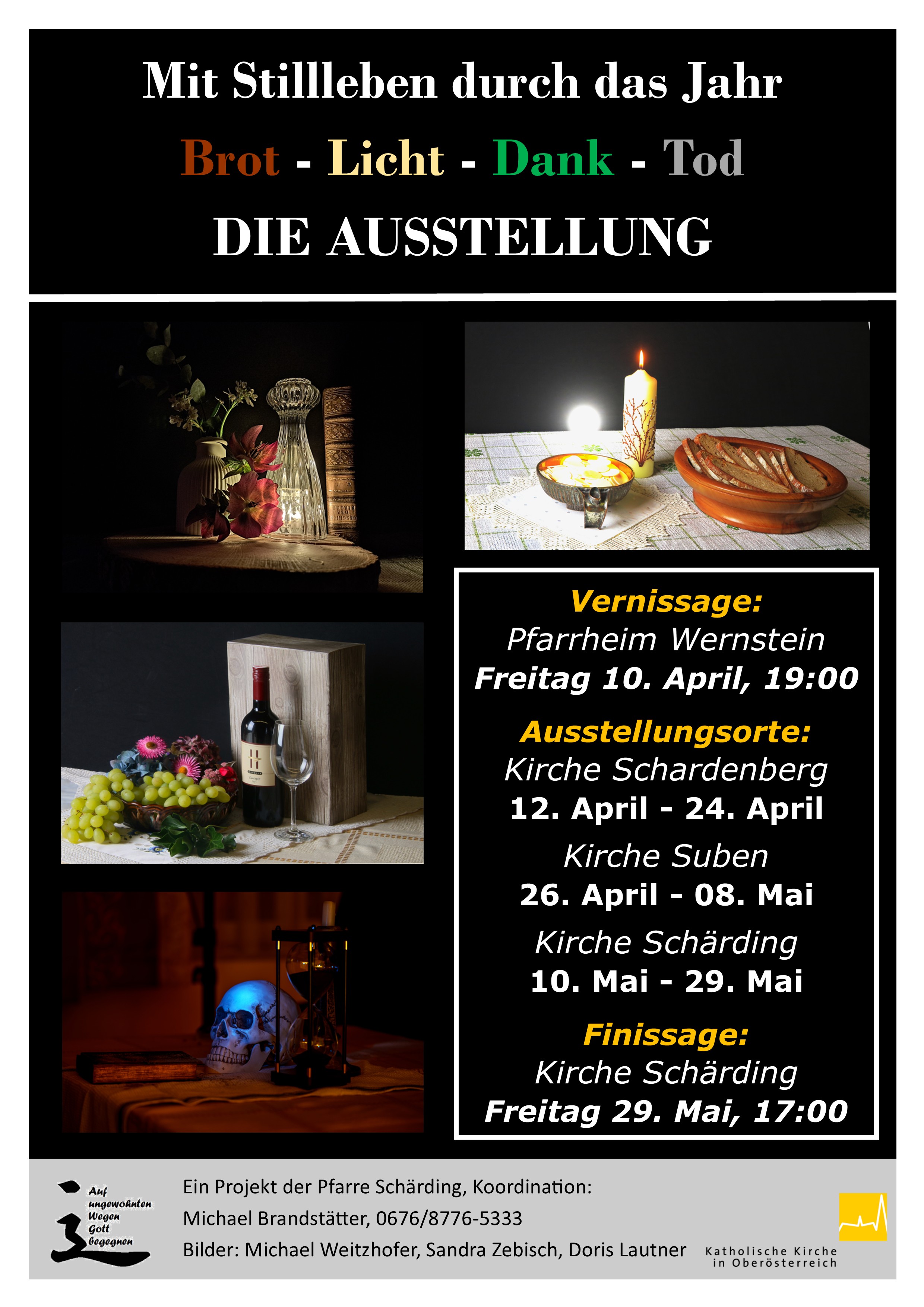 Im vergangenem Jahr 2025 lud Jan Jakubiak, Pfarrkooperator von Wernstein und St. Roman, zu Fotoworkshops zu den Themen Brot, Licht, Dank und Tod ein. Nach einem Impulsvortrag gab es Gelegenheit Stillleben passend zu dem jeweiligen Thema zu fotografieren. Beeindruckende Bilder sind dabei entstanden. Einige der Fotograf*innen stellen nach Ostern ihre bearbeiteten Fotografien ausgedruckt aus. Für manche ist es das erste Mal, dass sie ihre Bilder präsentieren.