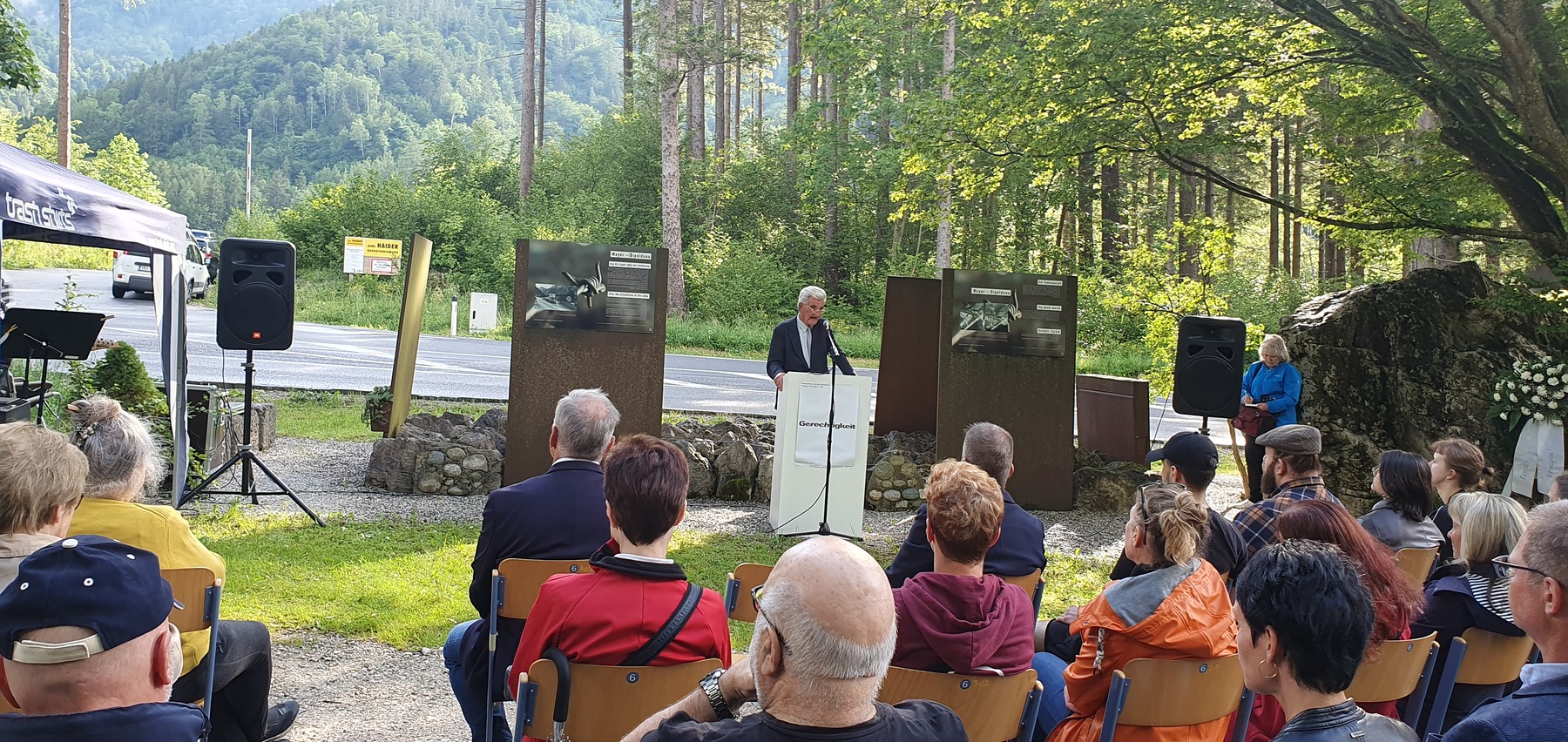 Der Gedenkredner Didi Bruckmayr (Musiker und Performancekünstler) und Helmut Edelmayr, (Gründungsmitglied des Mauthausen Komitee Österreich) schilderten eindrucksvolle Beispiele aus ihren Familiengeschichen.