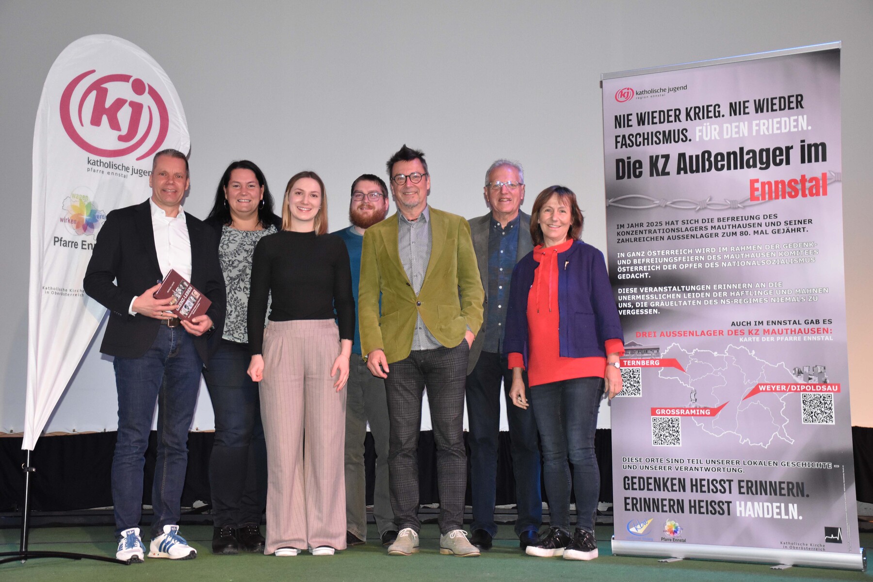 Am Ende der Podiumsdiskussion wurde zudem das neu gestaltete Roll-up zur Gedenkkultur im Ennstal den Besucher:innen vorgestellt. In der Pfarre Ennstal gab es drei KZ-Außenlager, an deren Geschichte das Roll-up erinnert. Es wird in den kommenden Monaten in allen neun Pfarrgemeinden – vor allem in den Pfarrkirchen – aufgestellt, um zur Bewusstseinsbildung beizutragen. Ergänzend dazu werden Begleittexte zur Verfügung stehen, die Hintergrundinformationen und persönliche Zeugnisse enthalten. So wird das Gedenken an die Opfer des Nationalsozialismus in der Region sichtbar und lebendig gehalten.